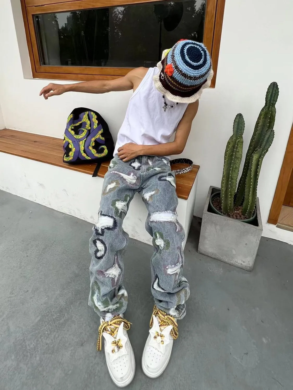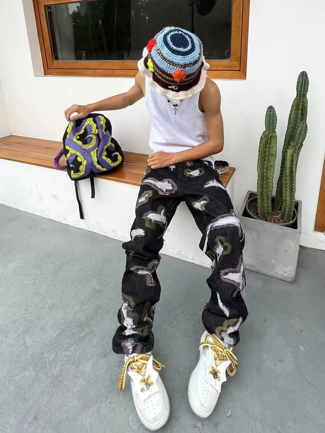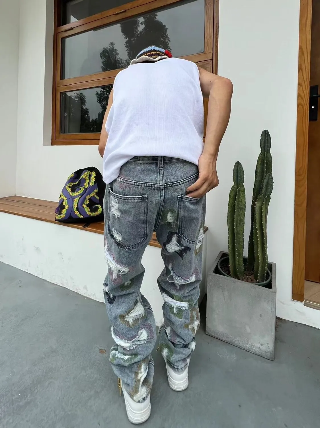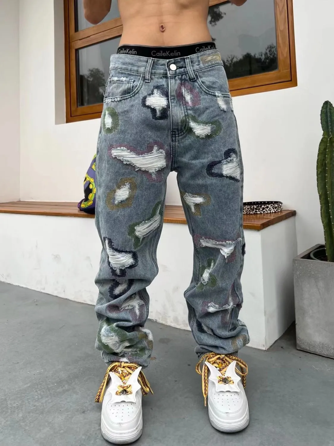 Hearujoy American-style ripped embroidered denim trousers men's and women's fashion same style loose straight trendy fashion trousers ins