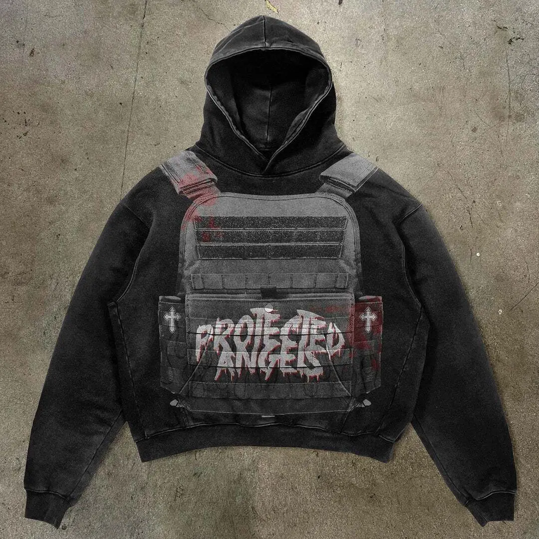 Hearujoy Body armor printed washed street hooded sweatshirt 2024 hot selling trendy retro loose fashionable sweatshirt for men and women