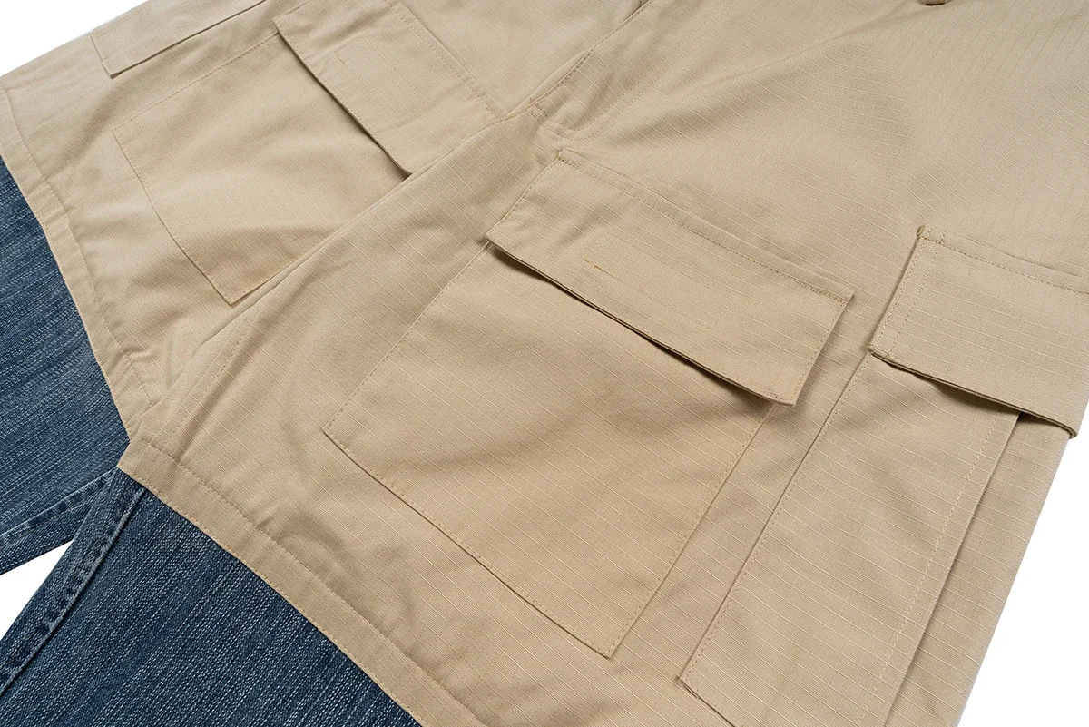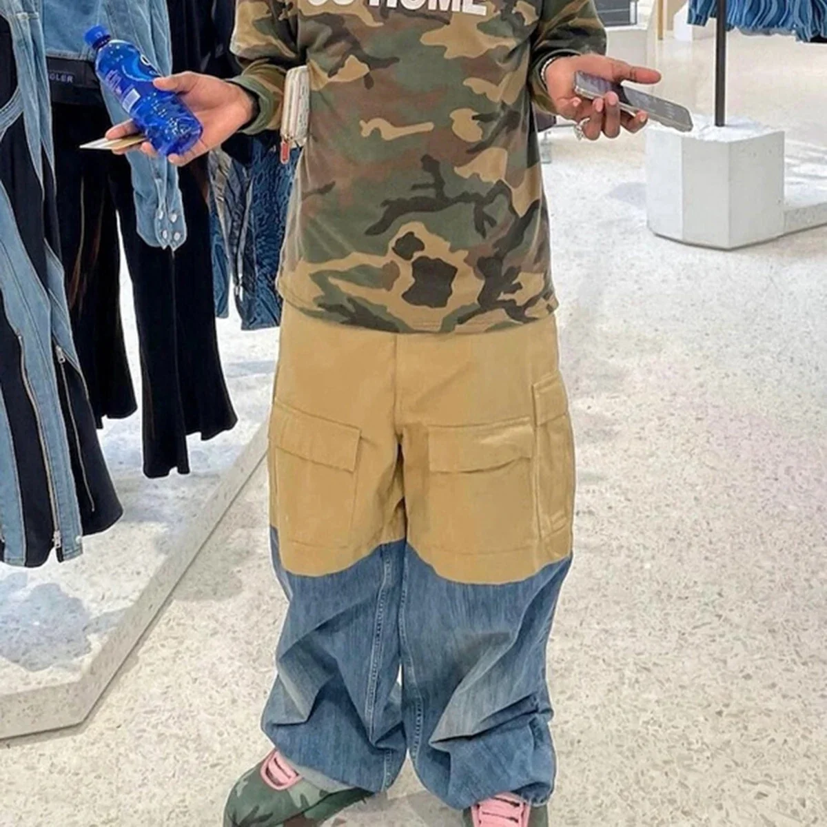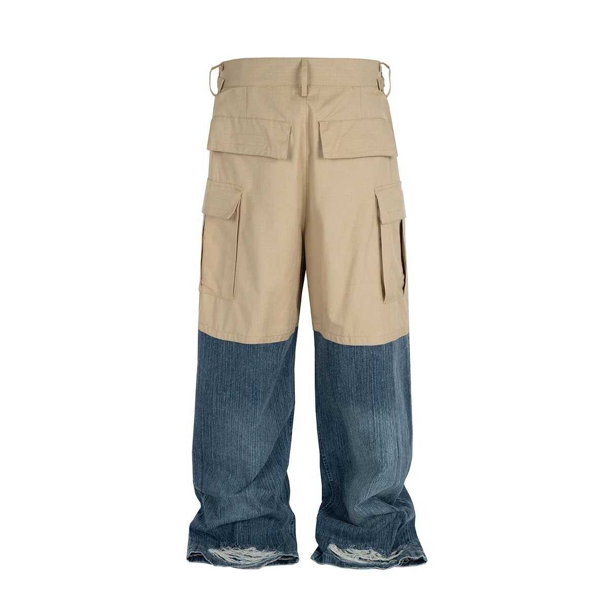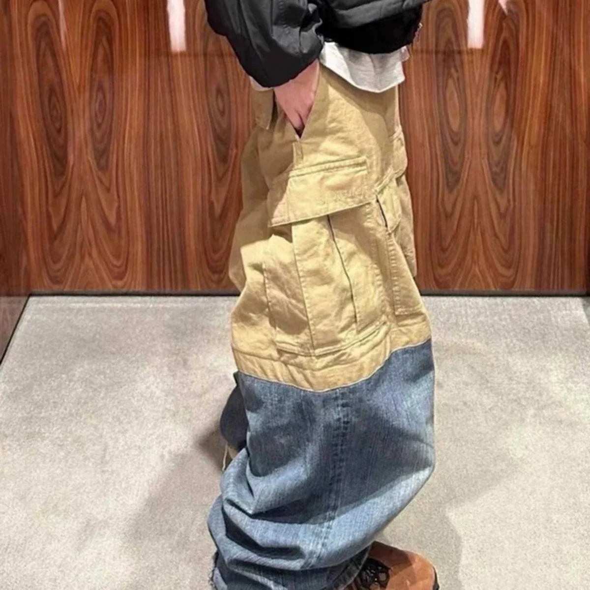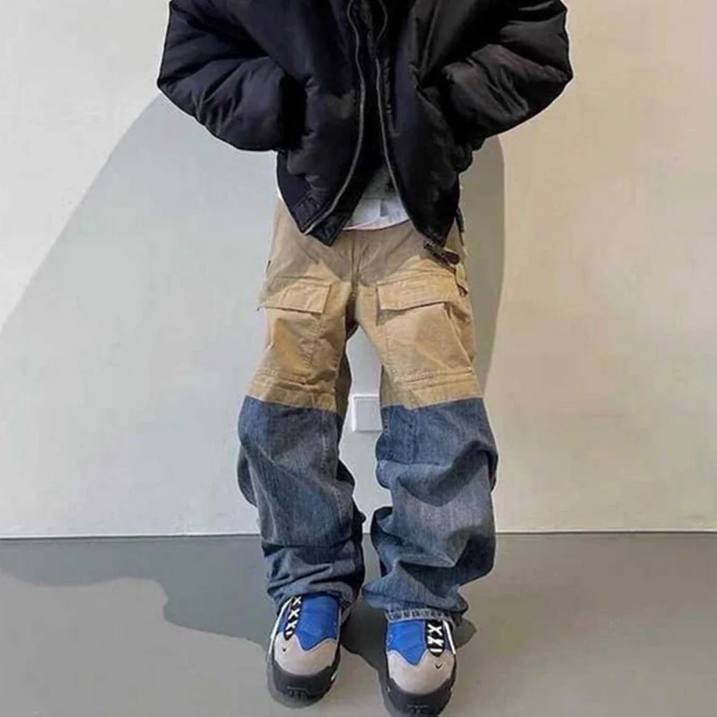 Hearujoy Color Match Ripped Hole Baggy Multi-pockets Wide Leg Cargo Pants Mens Streetwear Patchwork Loose Baggy Overalls Oversized Jeans