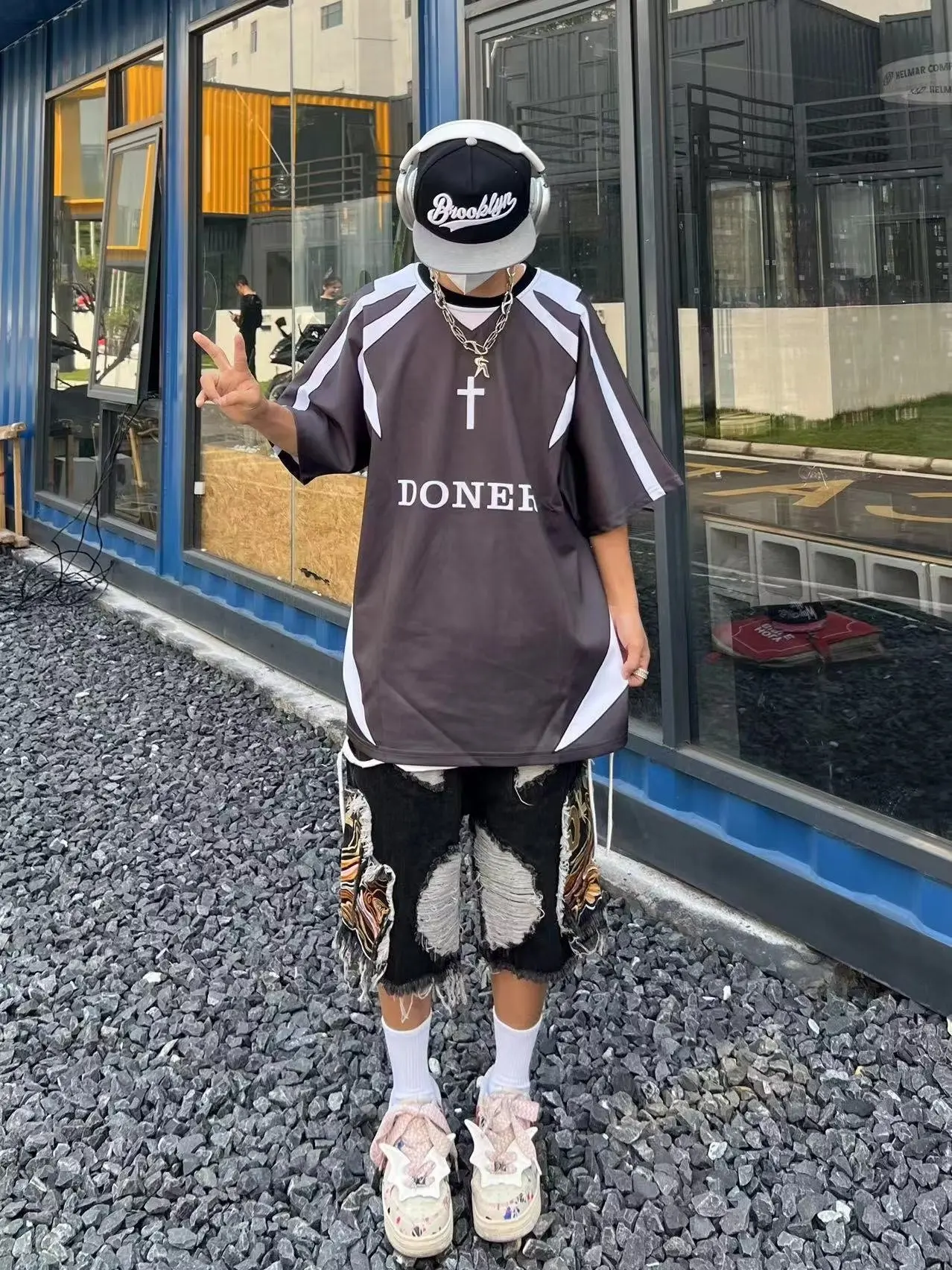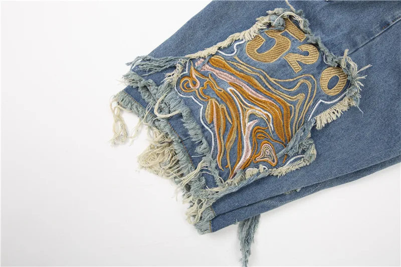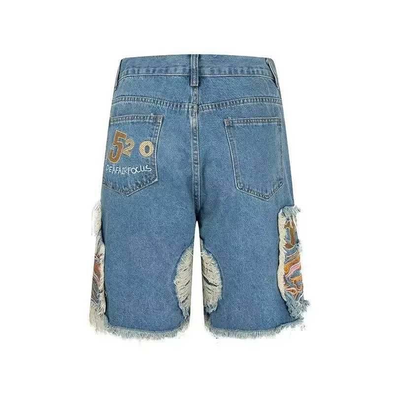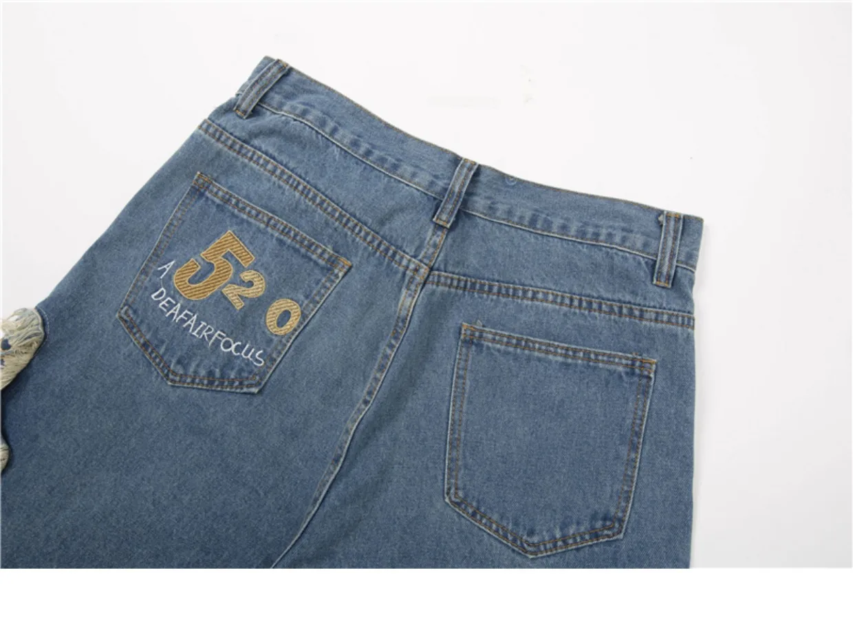 Hearujoy Embroidered tassel high street denim men's street hip-hop trendy brand ripped pants European and American fashion retro shorts