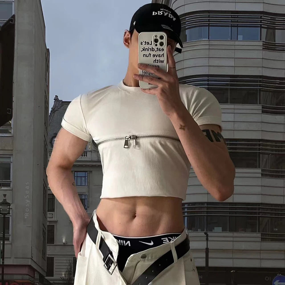 Hearujoy 2024 Men T Shirt Zipper Solid Color O-neck Short Sleeve Fashion Men Crop Tops Summer Streetwear Casual Camisetas Navy Navel Tees