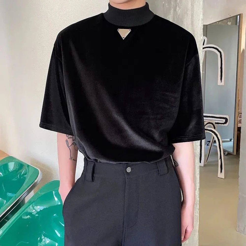 Hearujoy 2024 Summer Velvet Stand-up Collar Short-sleeved Men's T-shirt Personality Triangle Logo Trend Loose Top Ruffian Handsome Retro