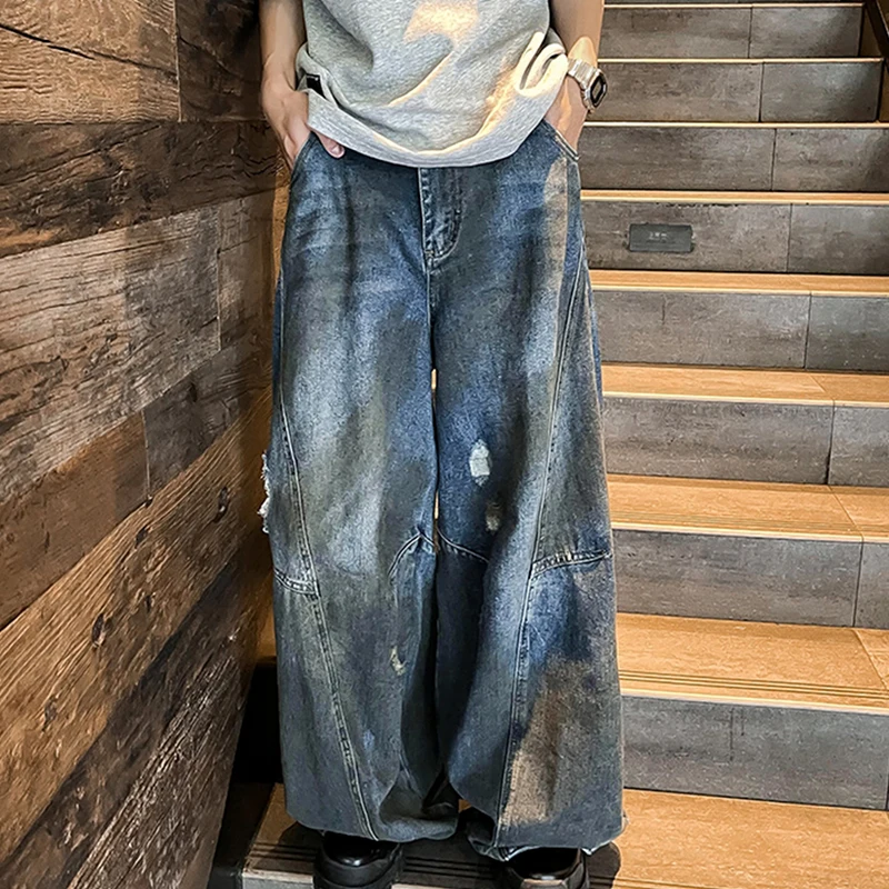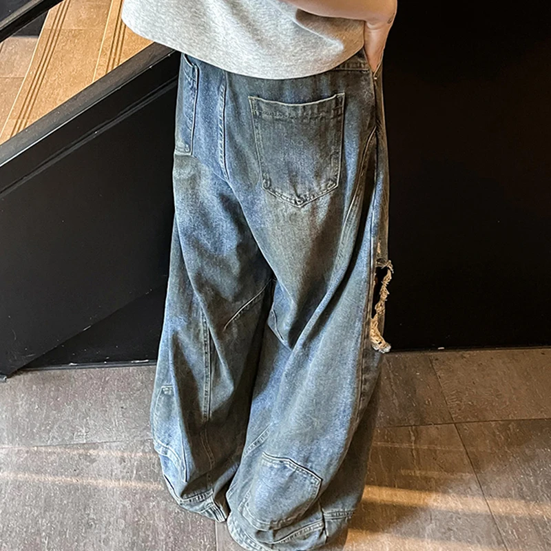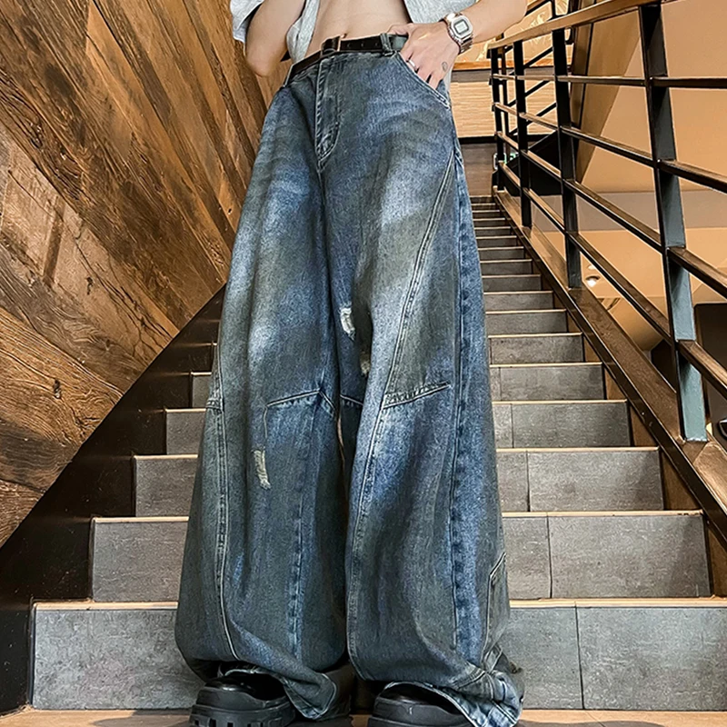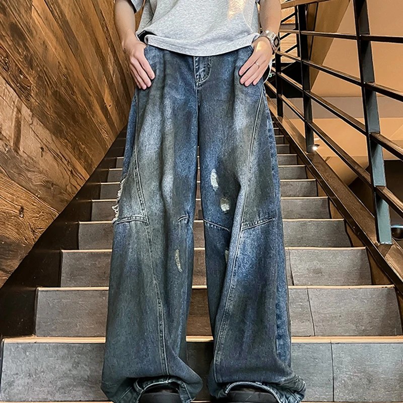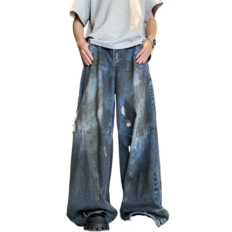 Hearujoy American Fashion Ripped Jeans Men Retro Trendy Floor-length Wide-leg High Street Design Reverse Wear Loose Street Style Pants