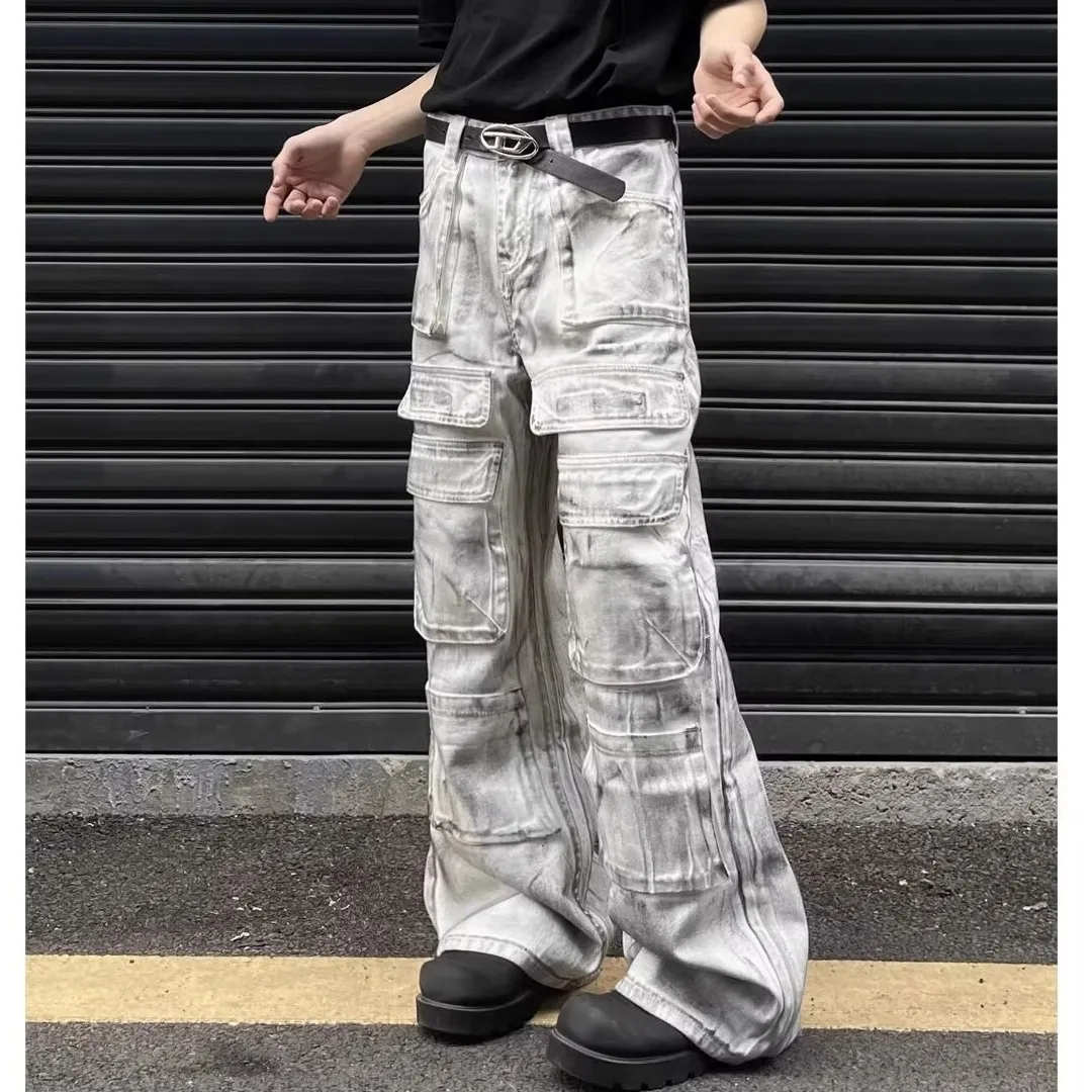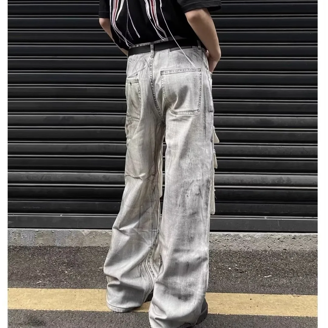 Hearujoy American retro distressed dirty multi-pocket jeans for men and women high street y2k loose trendy floor-length straight trousers