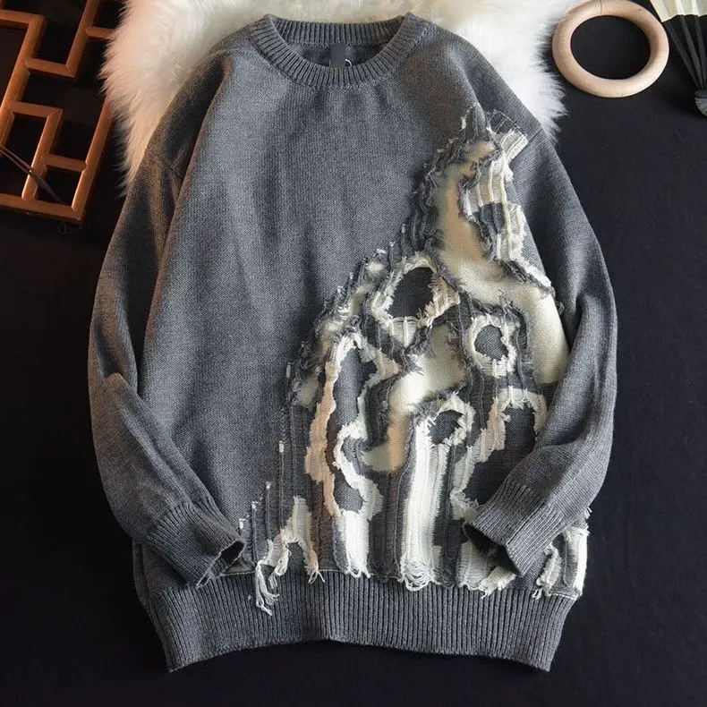 HEARUJOY - American Retro Ripped Men Women Autumn Winter Design Sense Thickened Couple Round Neck Sweater Jacket