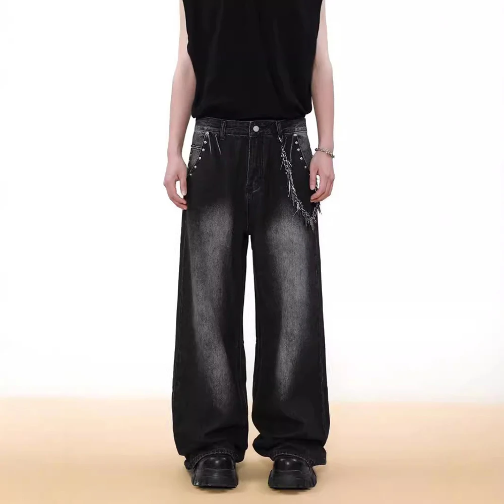 Hearujoy American Street Retro Washed Rivet Design Niche Jeans Men Autumn And Winter New Fashion Straight Wide-Leg Mopping Trousers Men