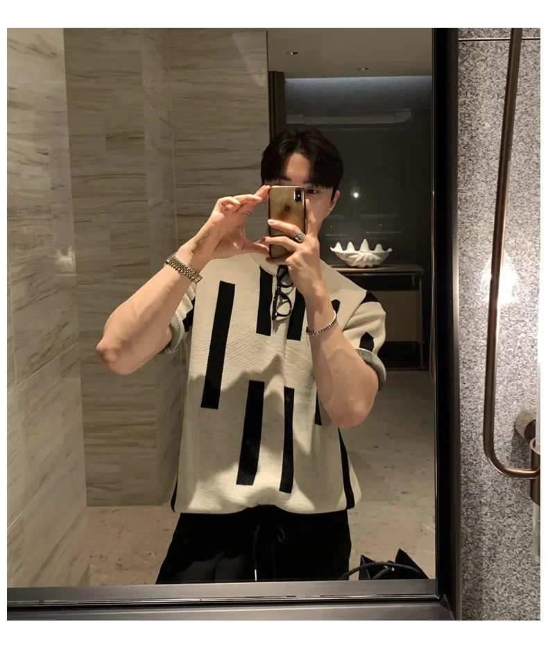 Hearujoy American Style High Street Round Neck Sensibility Knit Short Sleeves T-shirt For Men Summer New Trendy Vintage Casual Top