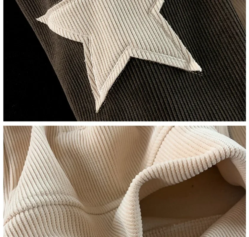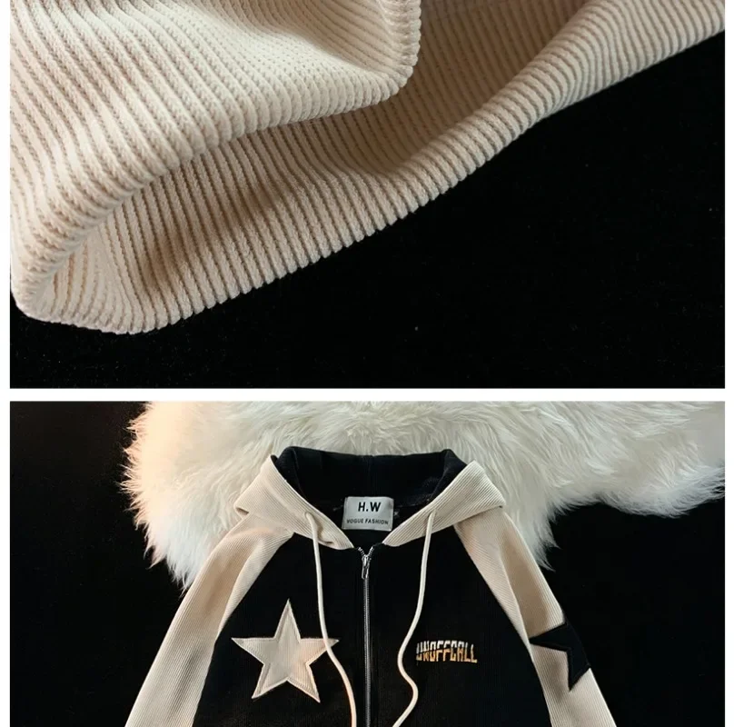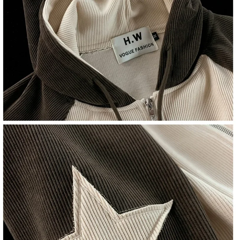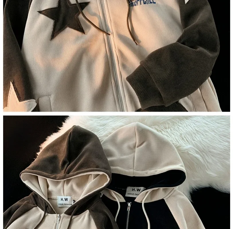 Hearujoy American Style New Star Patterned Patch Embroidered Zipper Hoodie Retro Corduroy Design Couple's Hip-Hop Harajuku Loose Cardigan