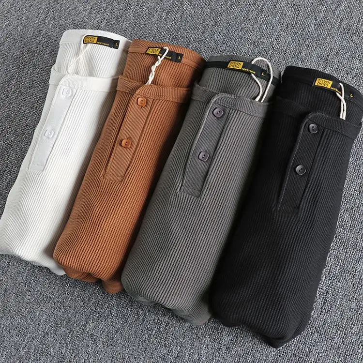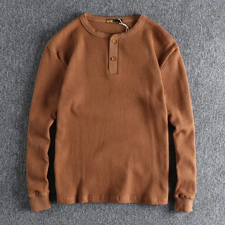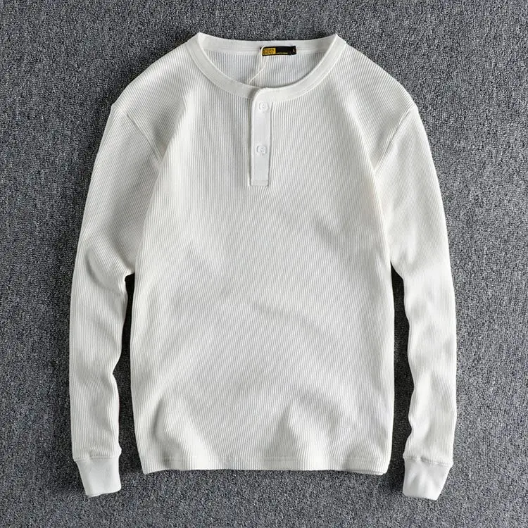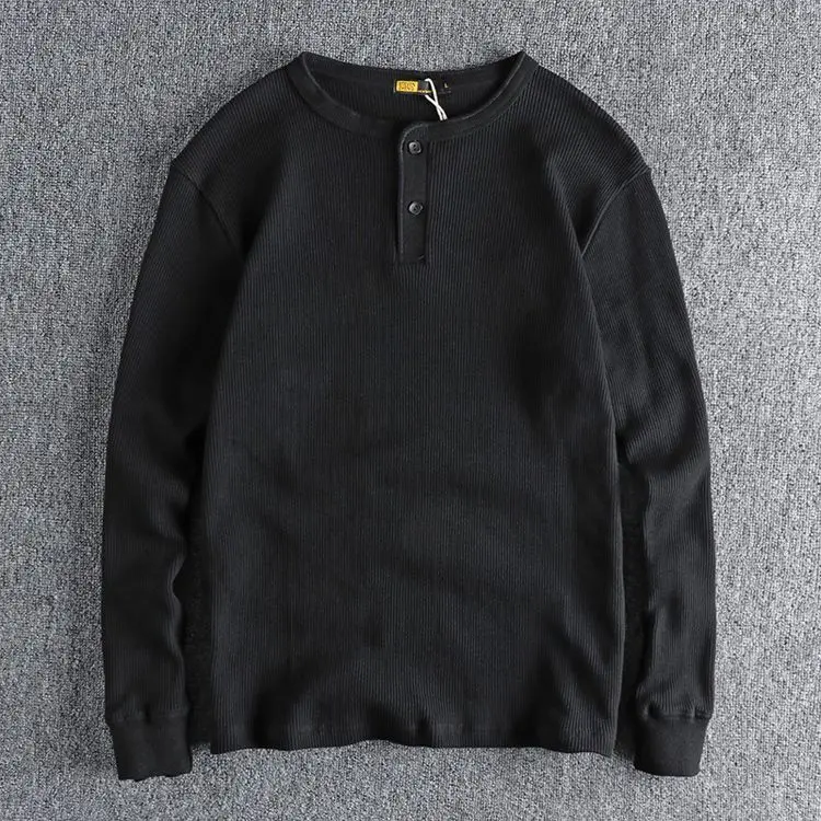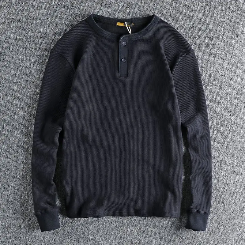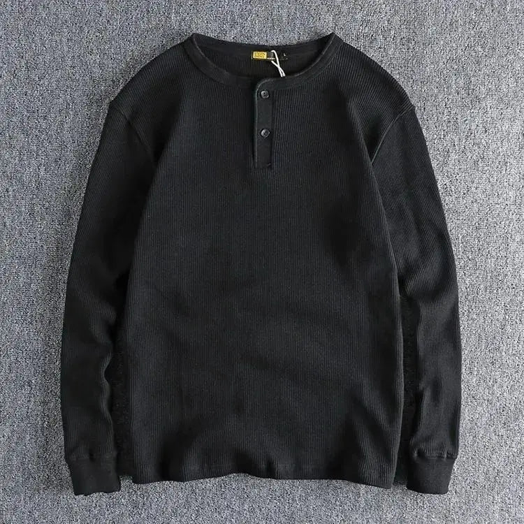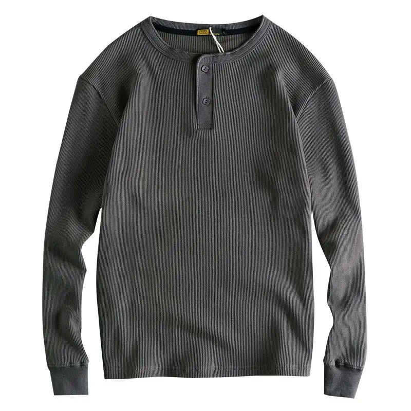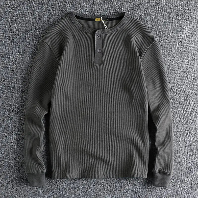 HEARUJOY - American Tough Guy Style Knitted Waffle Fabric Henley Long Sleeve T-Shirt Men's Autumn Winter Daily Versatile Youth Base Layer