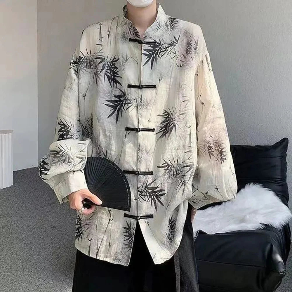 Hearujoy Art Men Chinese Style Hanfu Tops Traditional Ethnic Kung Fu Trendy Shirt Sunscreen Clothing Bamboo Leaf Pan Button Printing Top