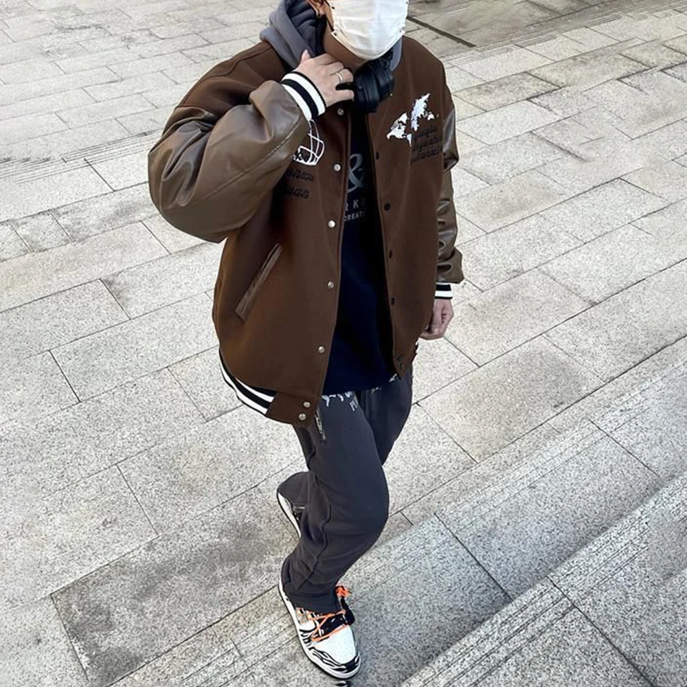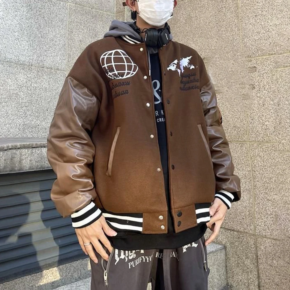 Hearujoy Autumn And Winter American Retro Baseball Jacket Men Letter Globe Embroidered Patchwork Casual Leather Sleeve Pilot Loose Jacket