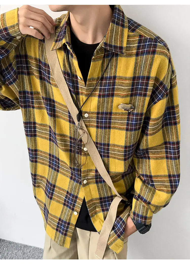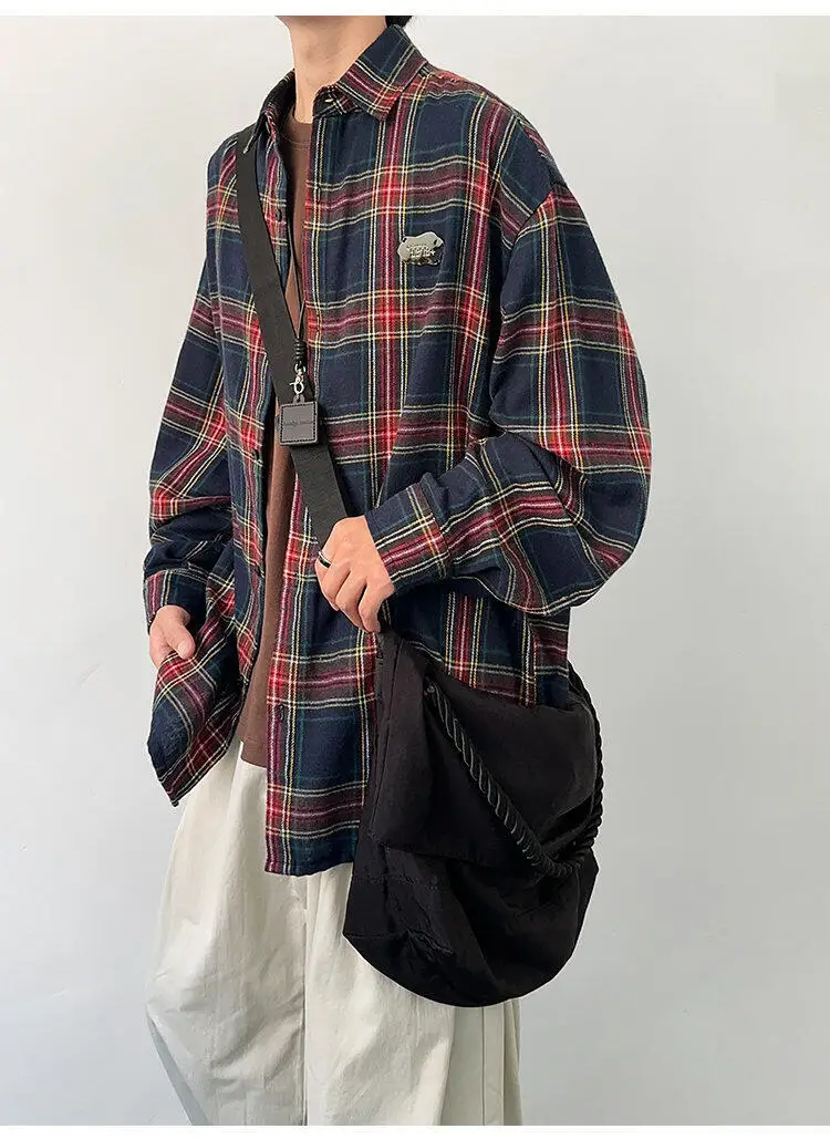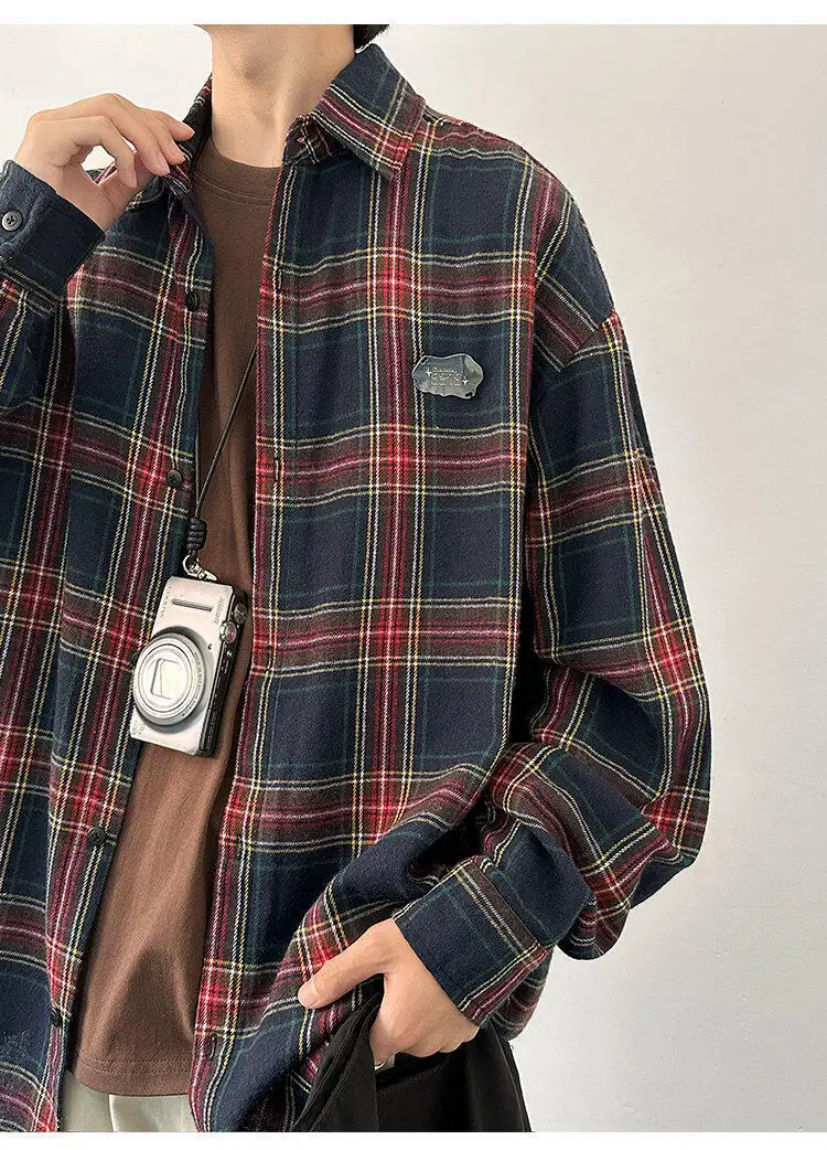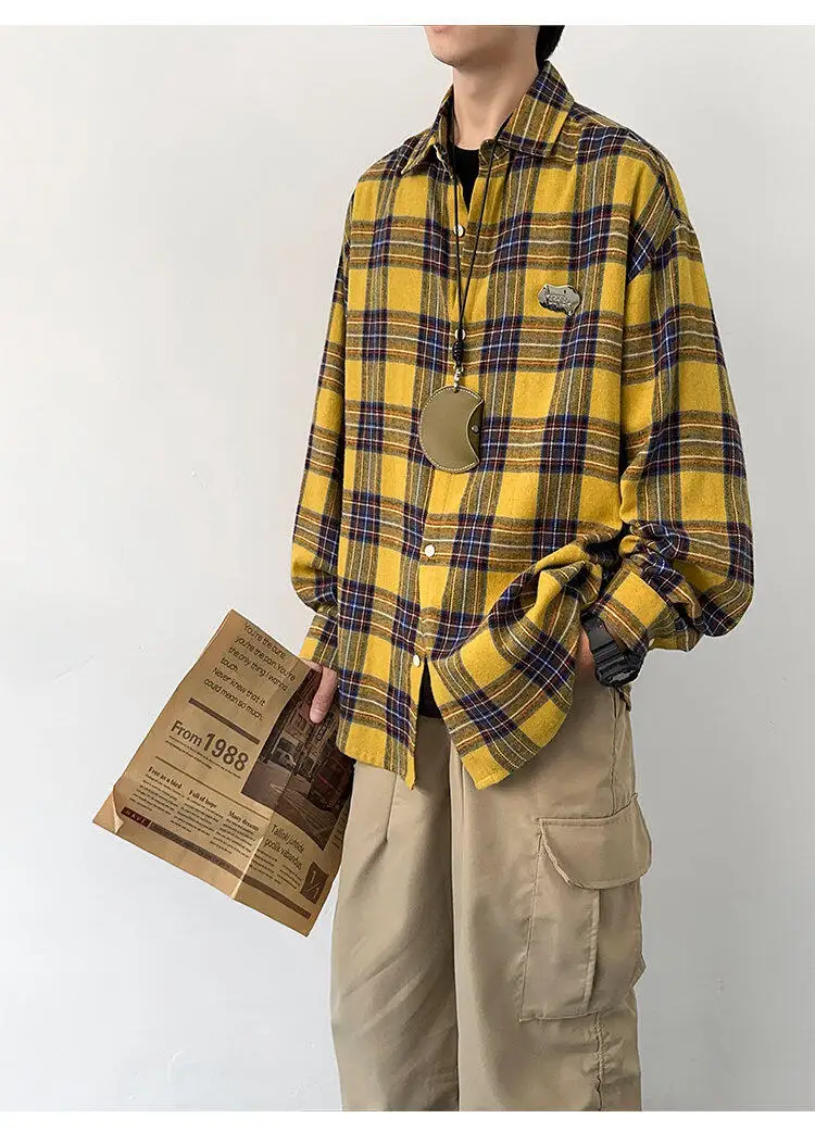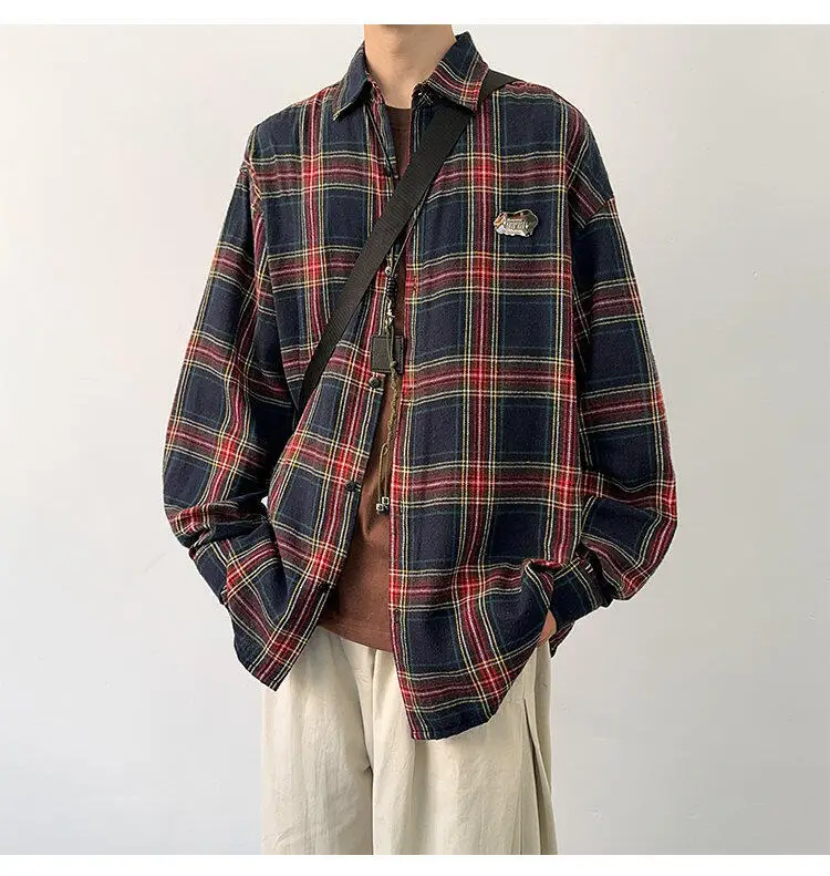 HEARUJOY - Autumn Long Sleeved Shirt Men Oversized Retro Casual Shirt Men Japanese Streetwear Loose Plaid Shirt Mens Vintage Shirts M-3XL