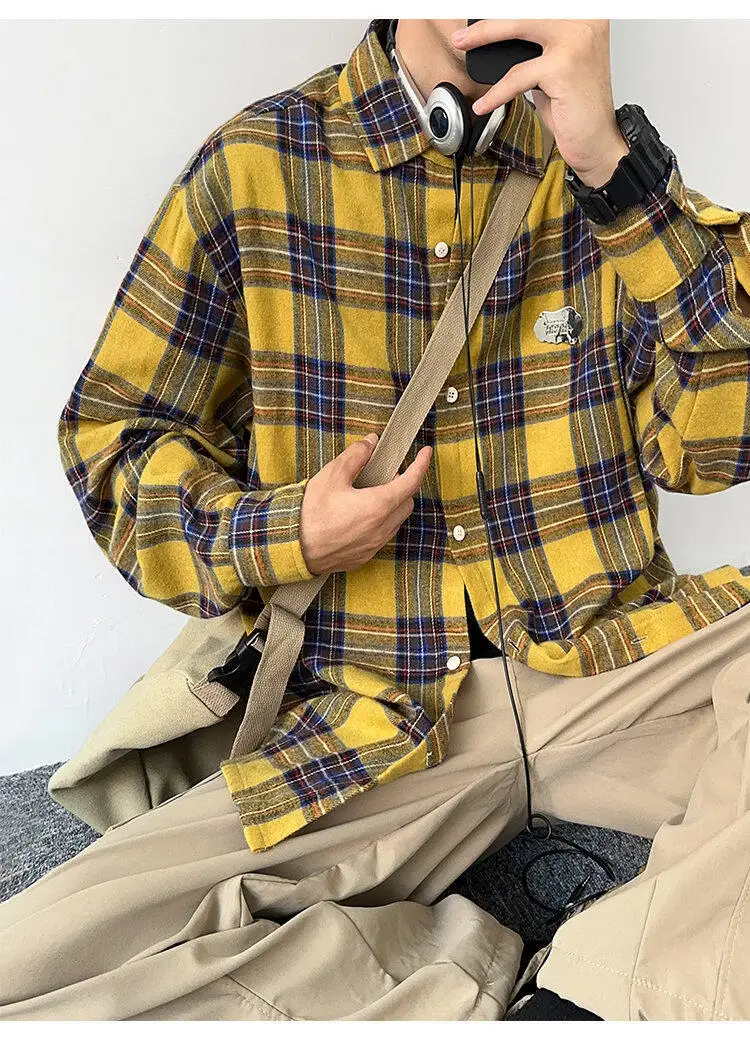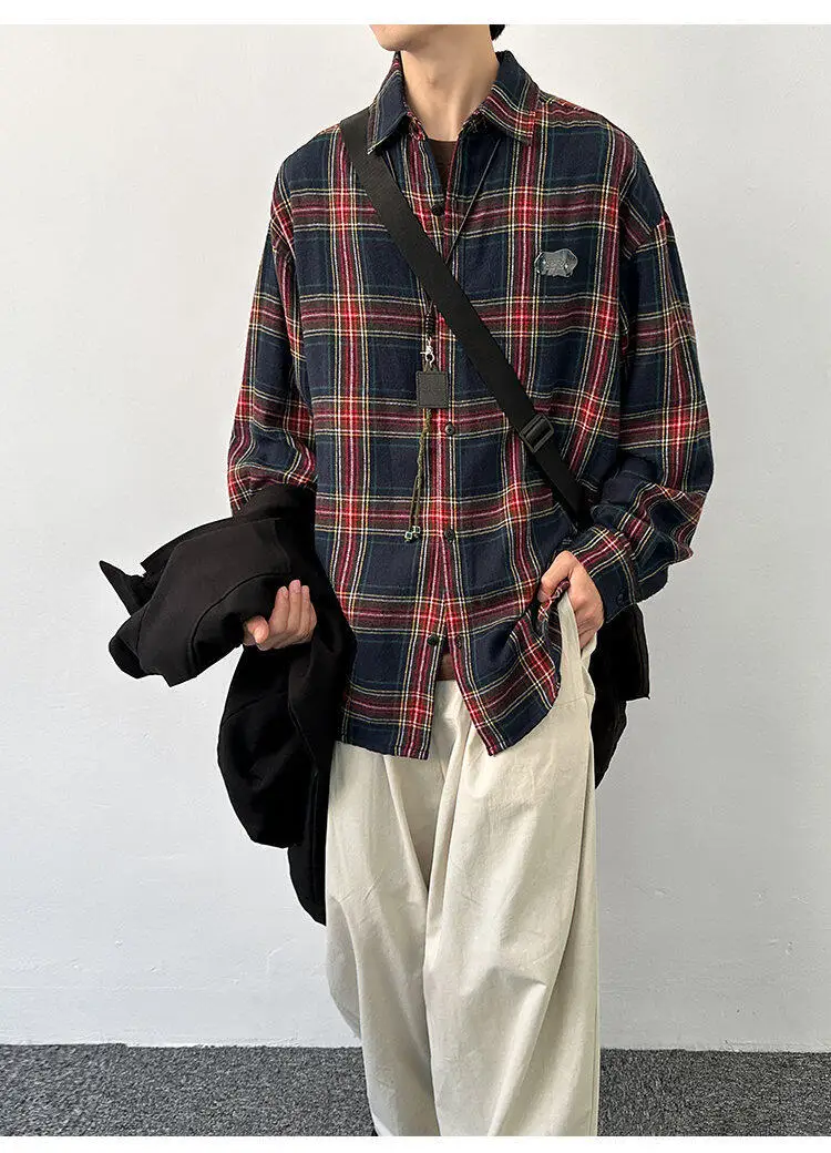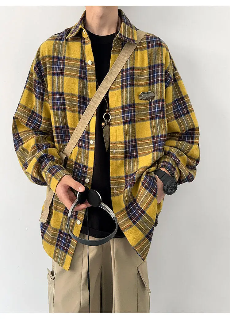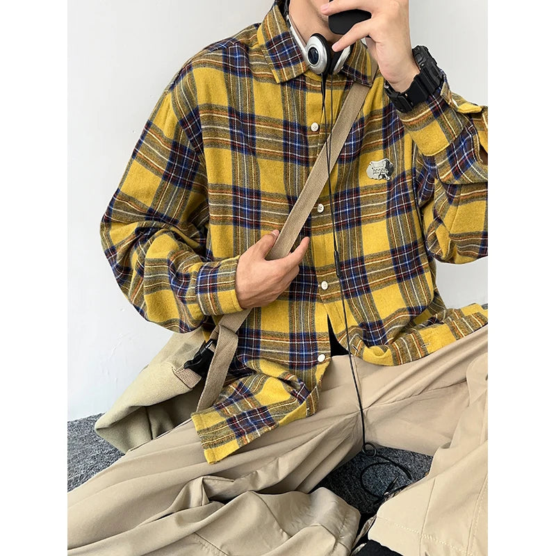 HEARUJOY - Autumn Long Sleeved Shirt Men Oversized Retro Casual Shirt Men Japanese Streetwear Loose Plaid Shirt Mens Vintage Shirts M-3XL