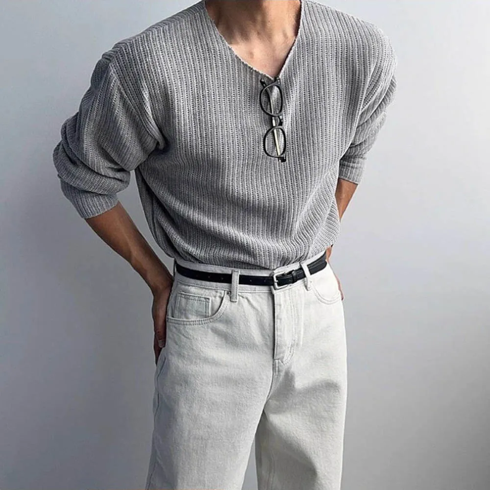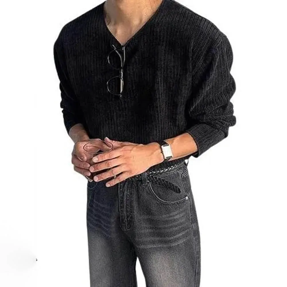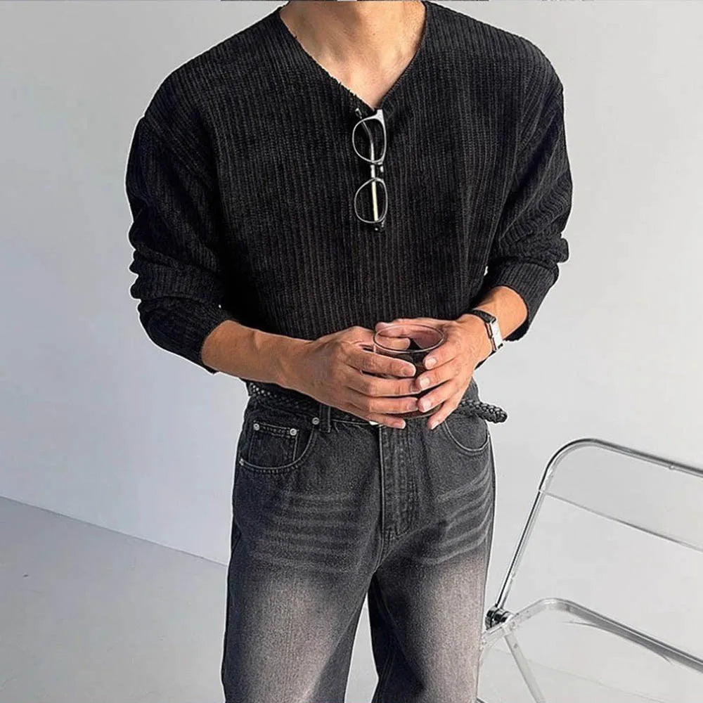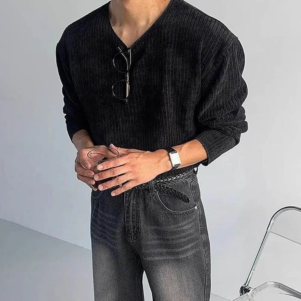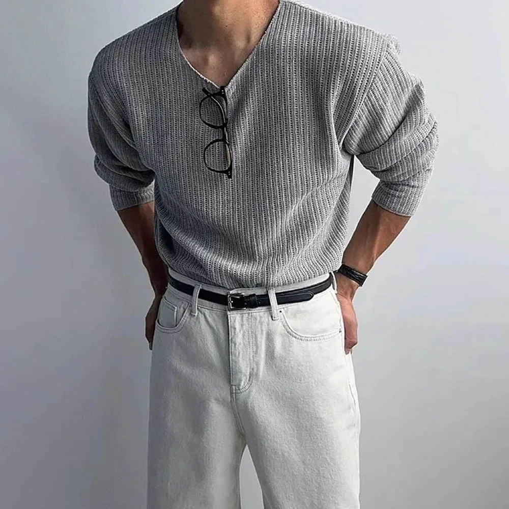 HEARUJOY - Autumn Men's Solid Color Knitted Long-Sleeved T-Shirt American Retro Fashion Trend Loose Street Casual Breathable Men's New Tops