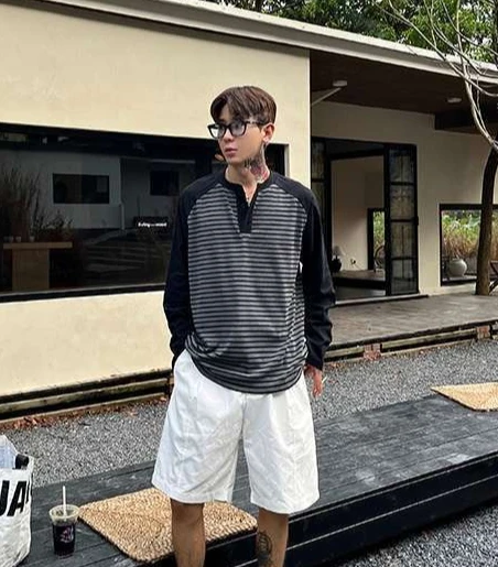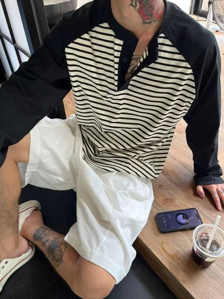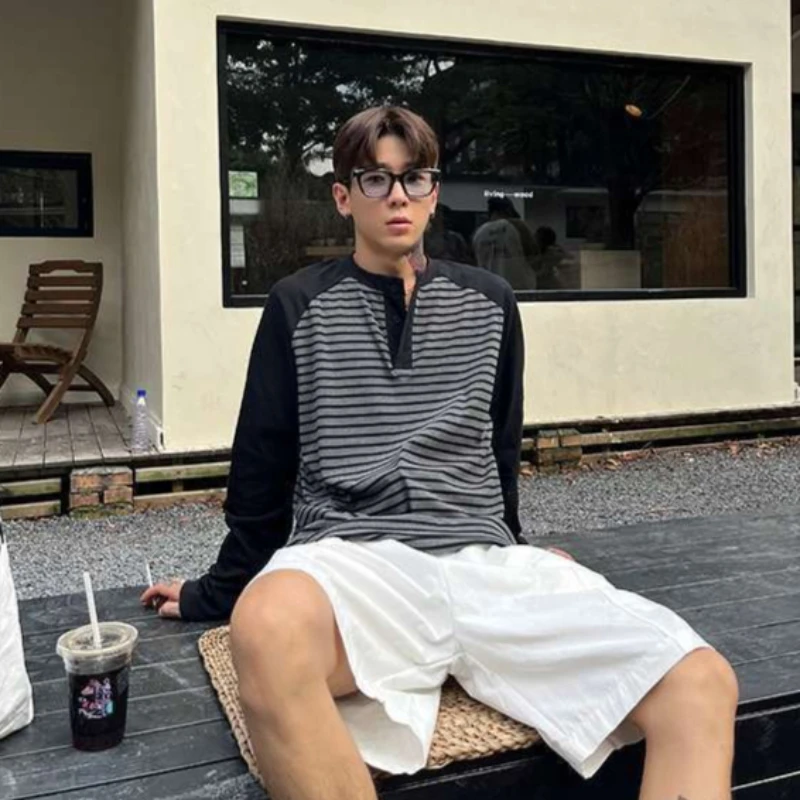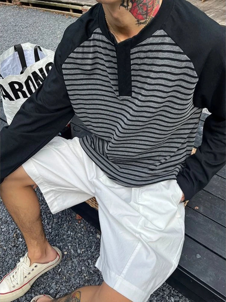HEARUJOY - Autumn Winter Men's Plus Size 300 Jin 150kg Loose Fit Long Sleeve T Shirt Color Blocking Raglan Striped Layering Top