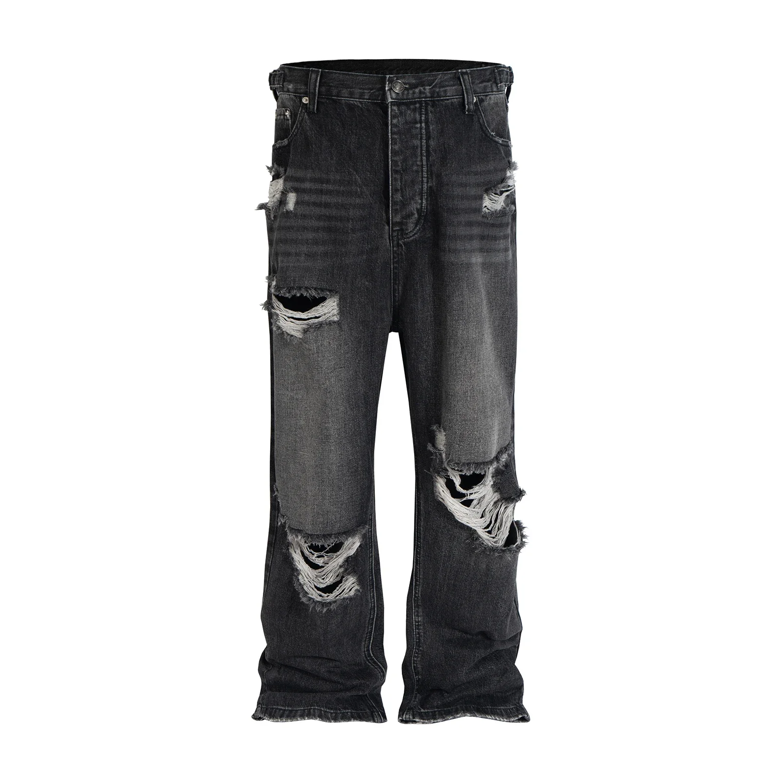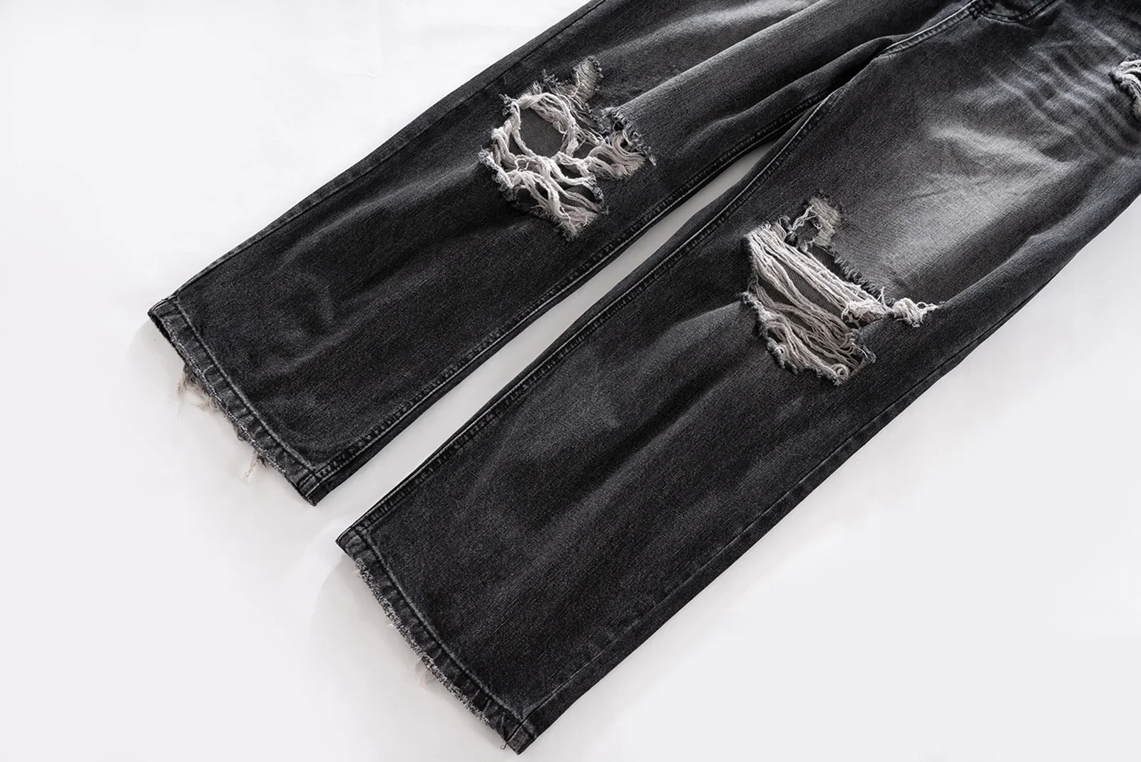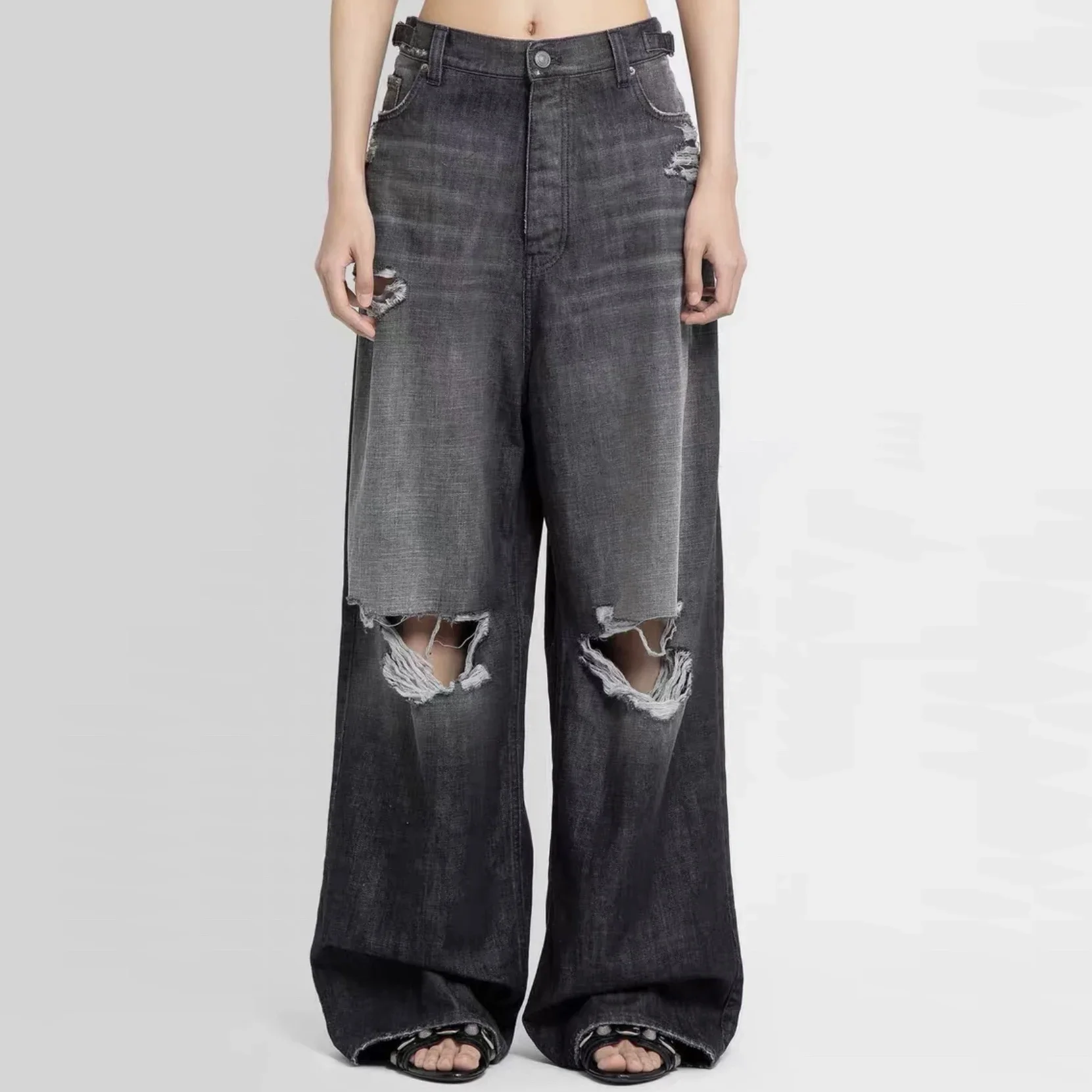 Hearujoy Baggy Damaged Hole Frayed Wide Leg Jeans for Men and Women Straight High Street Ripped Denim Trousers Oversized Cargo Pants