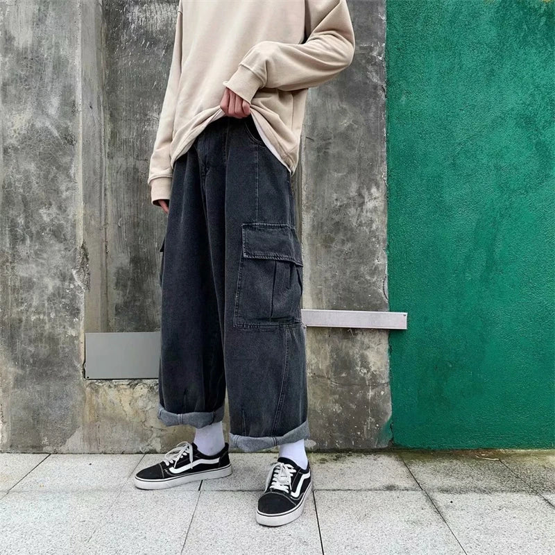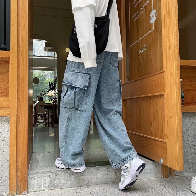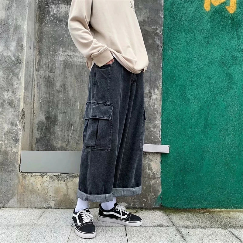 HEARUJOY - Baggy Jeans Men's Oversize Streetwear Fashion Wide Leg Cargo Pants Hip Hop Harajuku Multi-Pocket Denim Trousers Black Blue