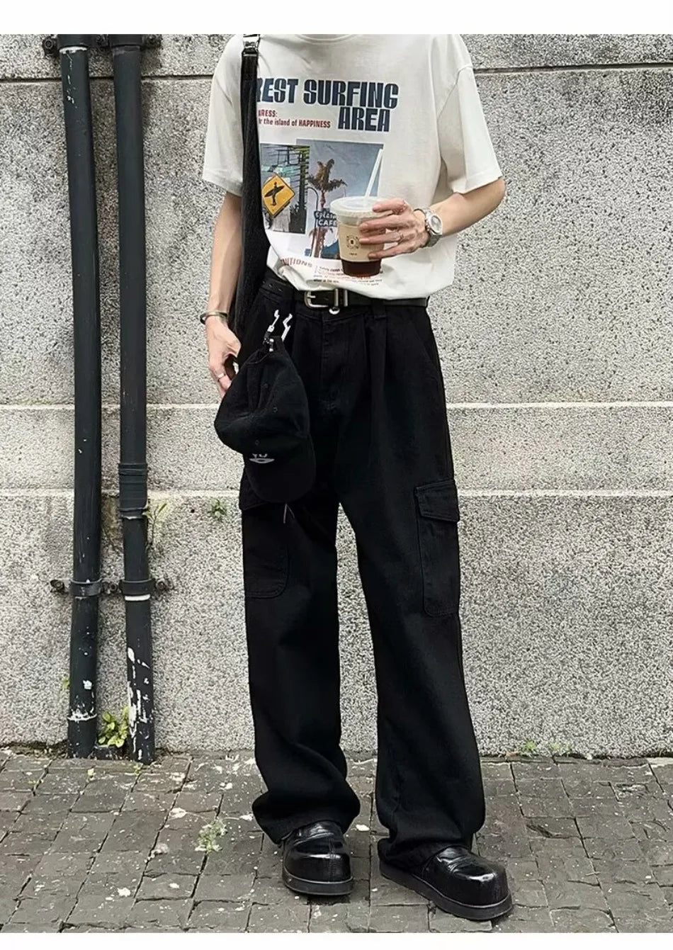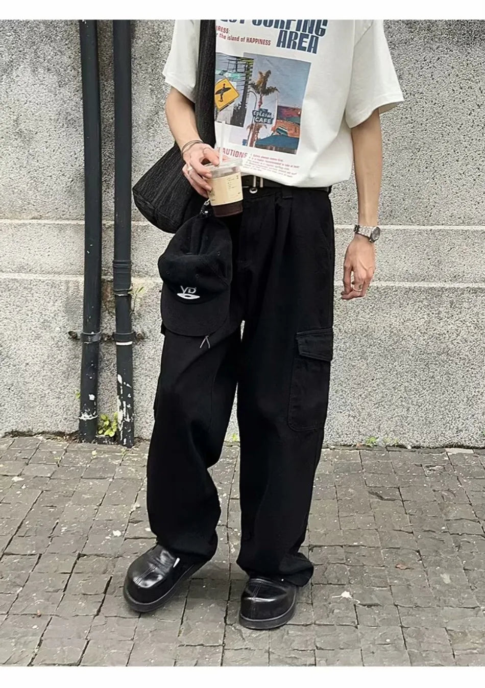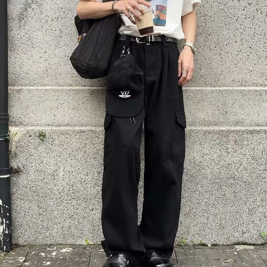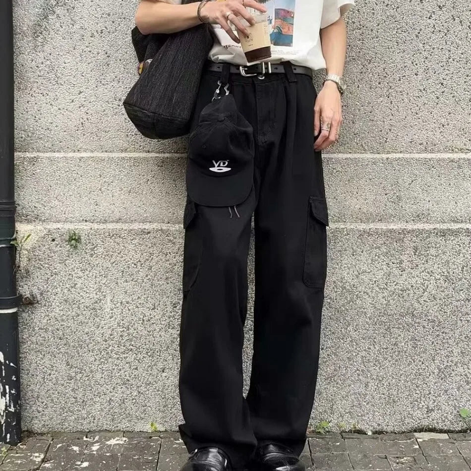 HEARUJOY - Big Pocket White Mens Cargo Pants Loose Straight Tube High Street Trousers Solid Simplicity Trend Wide Legs Overalls
