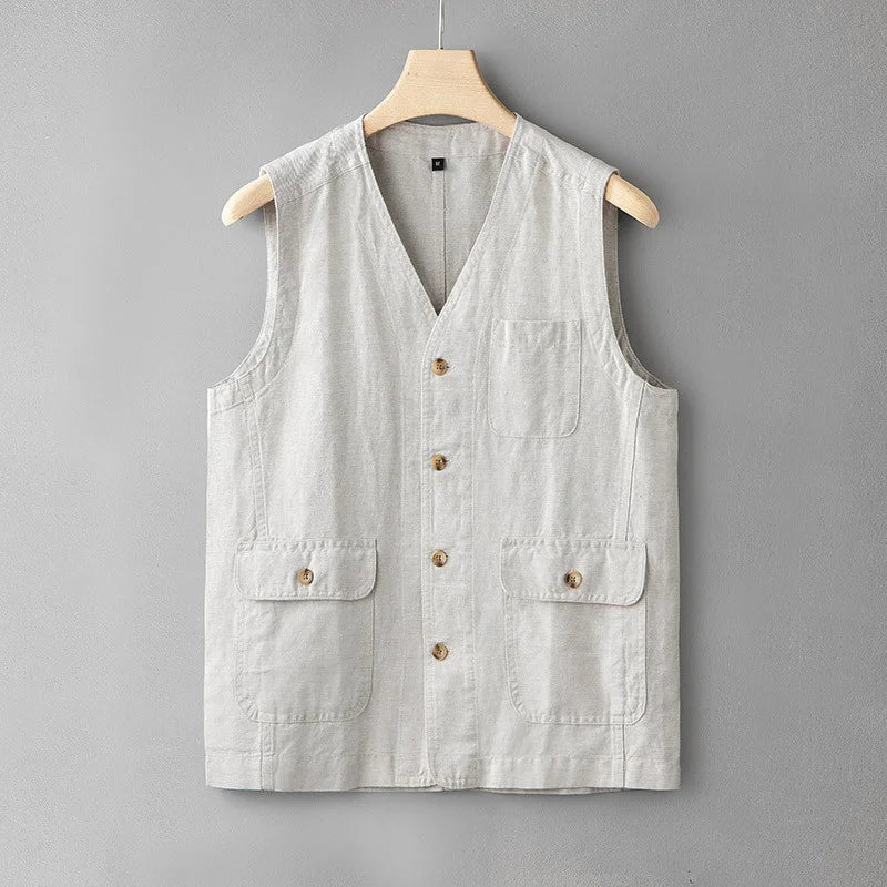 HEARUJOY - Casual Men Loose Linen Cotton Vest Japanese Retro Sold Color Multiple Pockets Workwear Sleeveless Top V-neck For Male