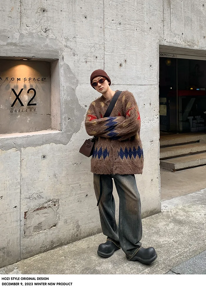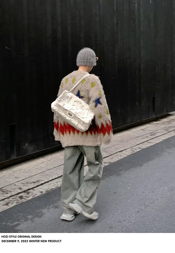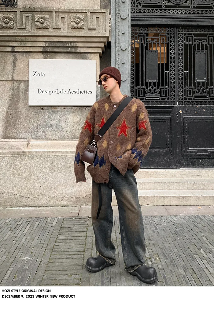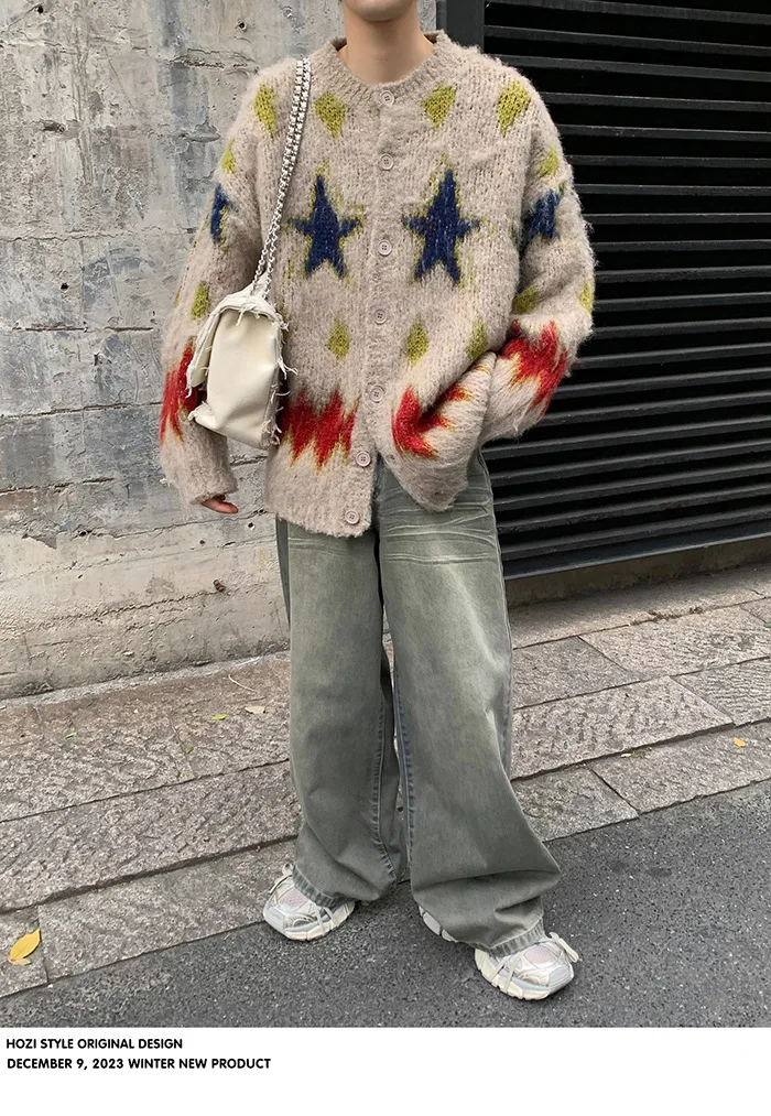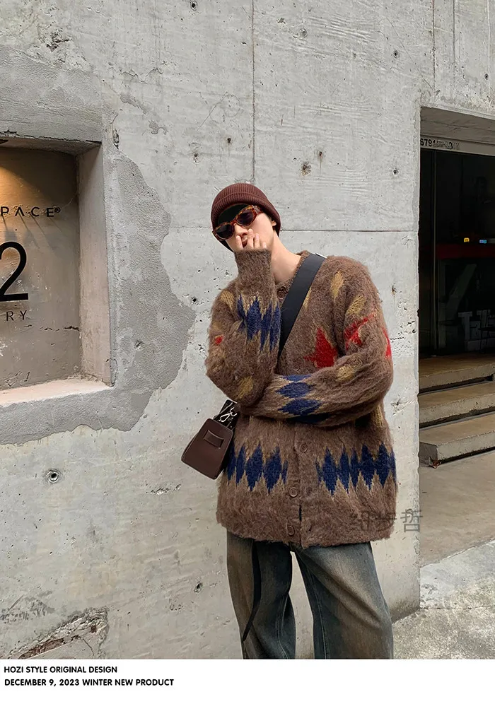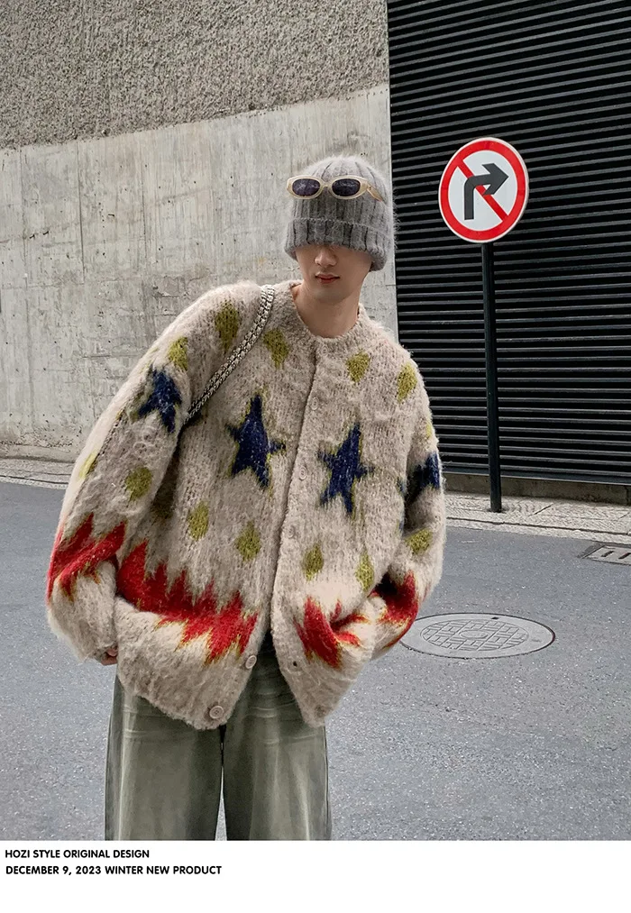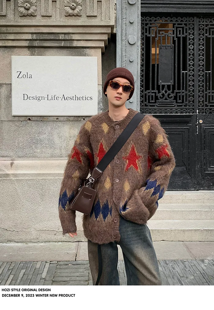 Hearujoy Christmas Atmosphere Sweater Jacket Men's Autumn and Winter Loose Retro Lazy Style Star Diamond Grid Knitted Cardigan Clothing