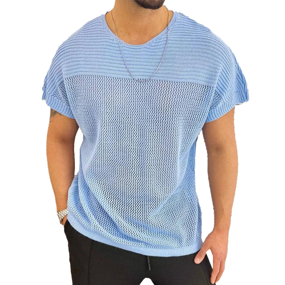 HEARUJOY - Comfort Men Top T-shirts O Neck Hollow Out Knitted Knitting Loose Regular Short Sleeve Solid Sports Stylish Summer