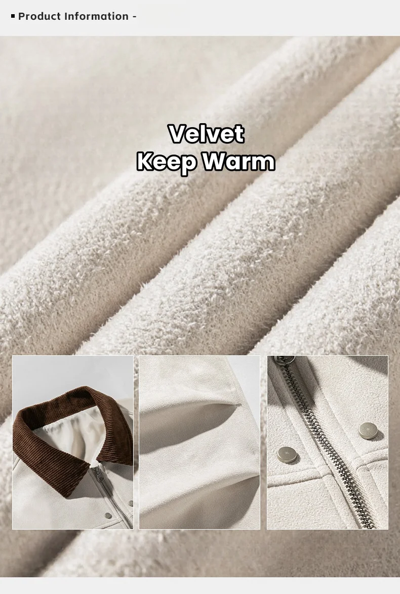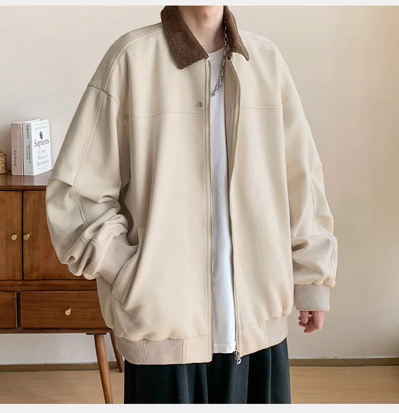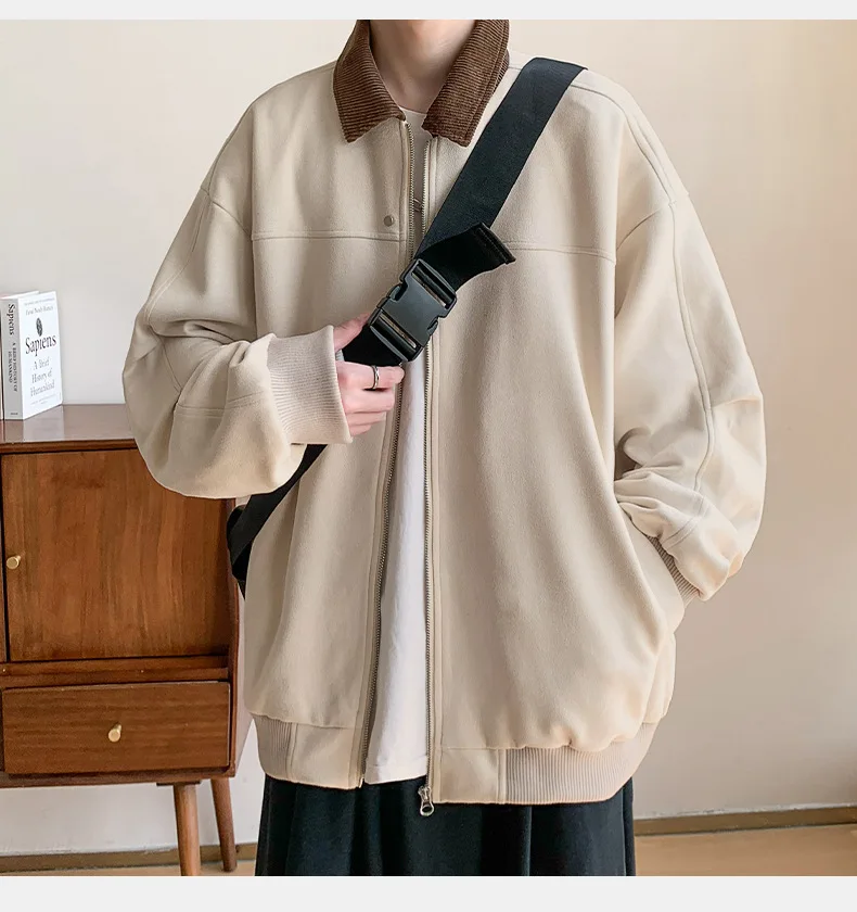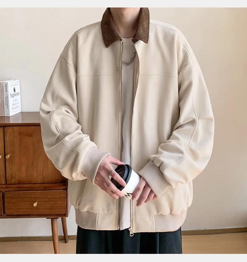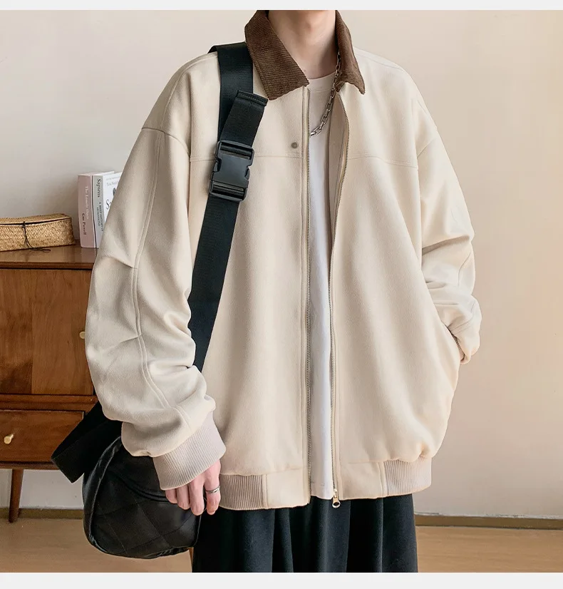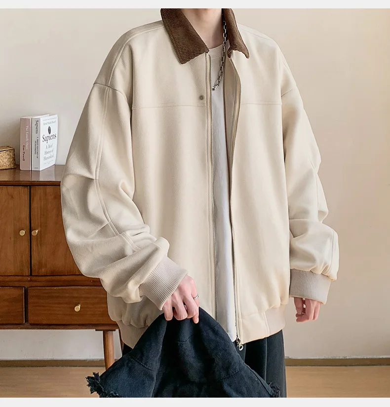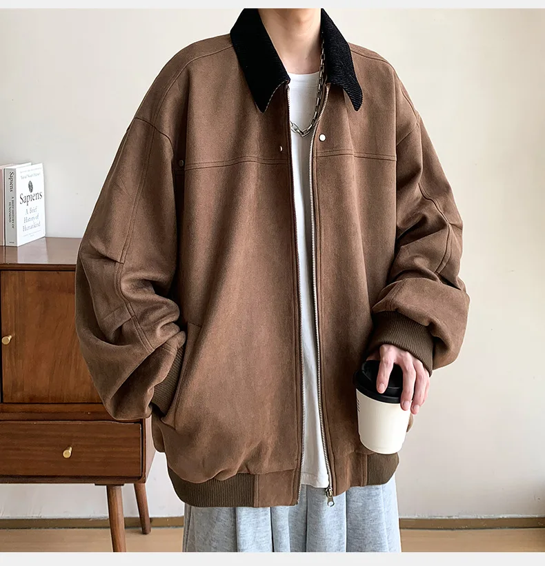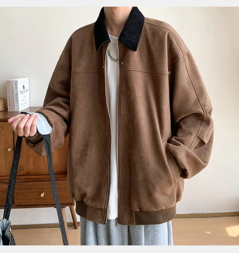 Hearujoy Corduroy Solid Colour Splicing Retro Suede Jacket Men's Autumn Winter Pocket Lapel Zipper Design Loose Jacket Warm Soft
