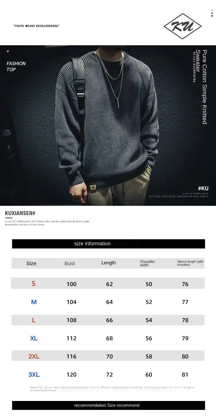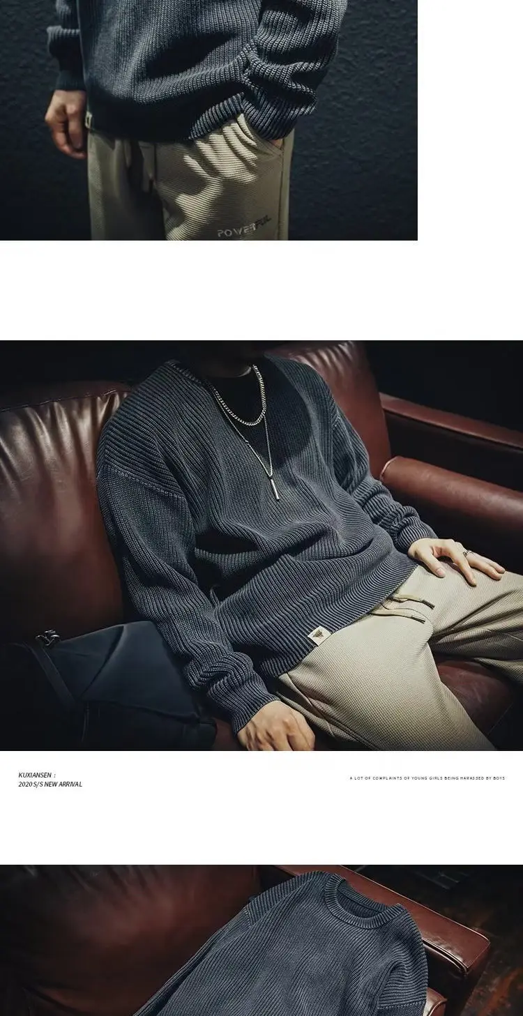 Hearujoy Cotton Sweater Men's Loose Fitting Trendy Brand Retro Plus Size Thread Jacket Chubby Round Neck Thick Knit Sweater
