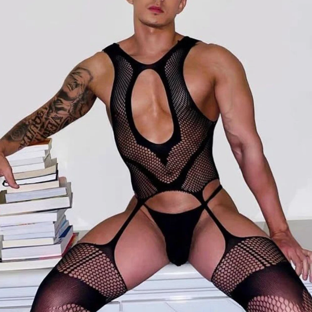Hearujoy Crotchless Lingerie Men Black Stockings High Fishnet Sexy Tights Pantyhose Mesh LGBT Bodystockings Man Jumpsuit Bodysuit