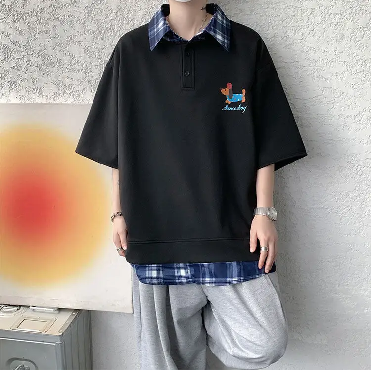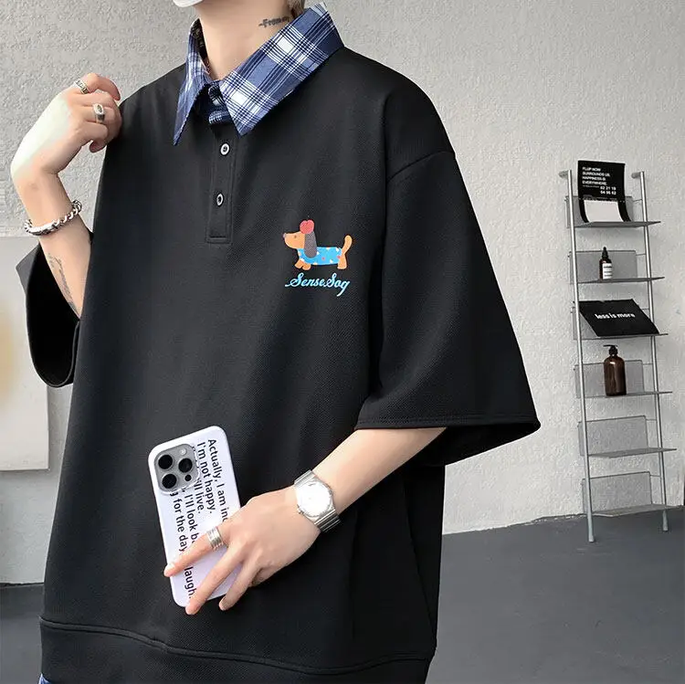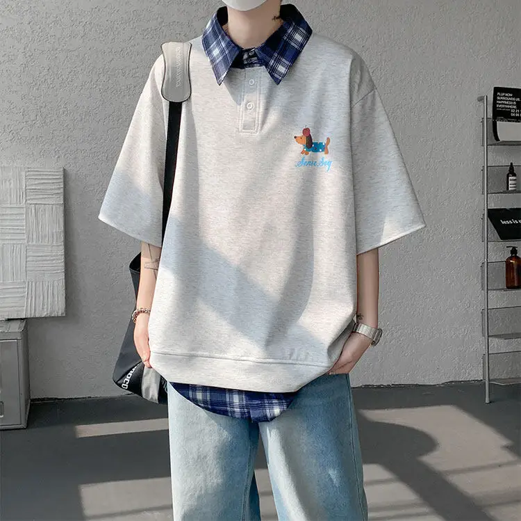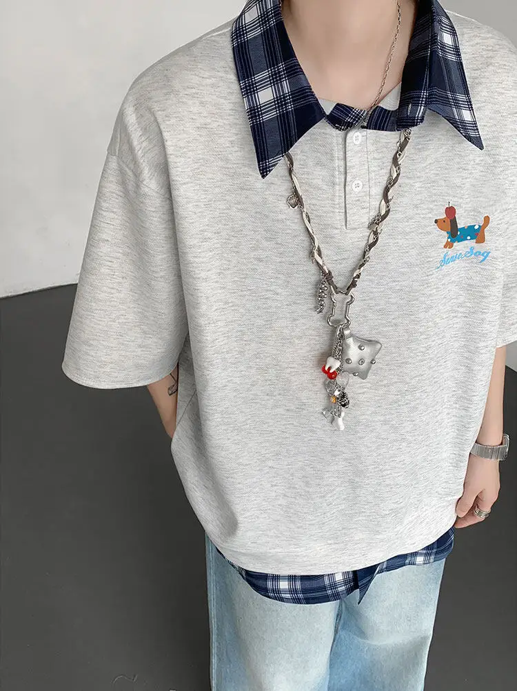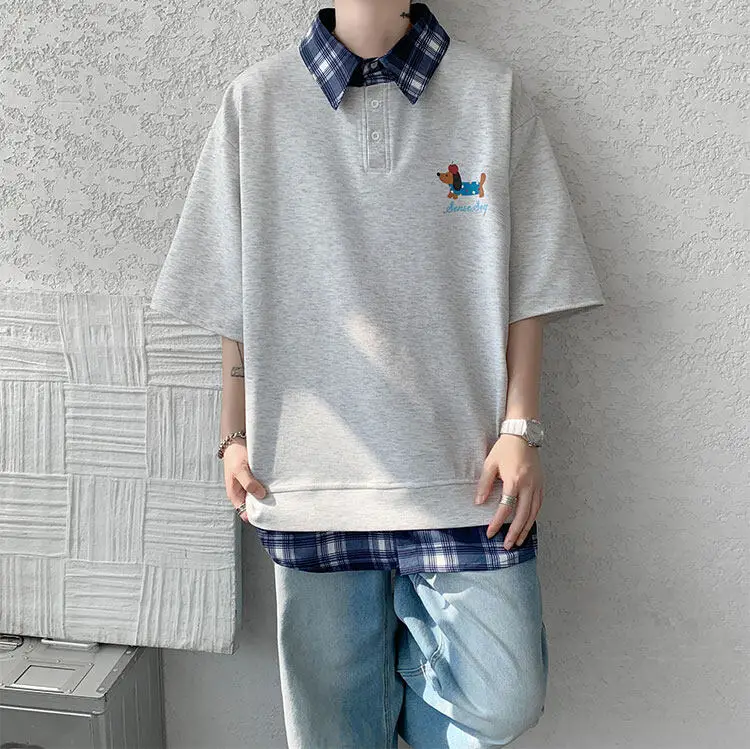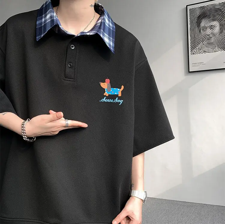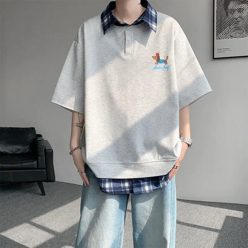 HEARUJOY - Dog Embroidery Plaid Polo Short Sleeve T-Shirt 2025 Summer Retro Couple T-shirts Splicing Fake Two Pieces Simple Tops