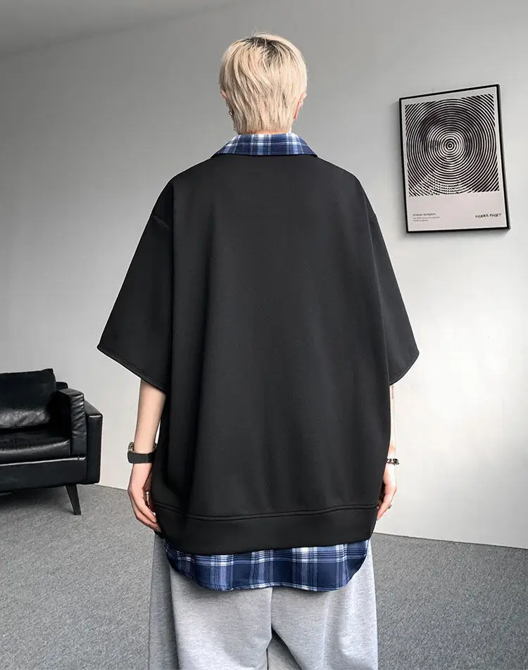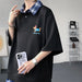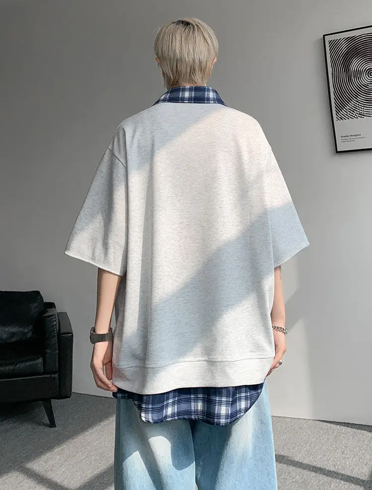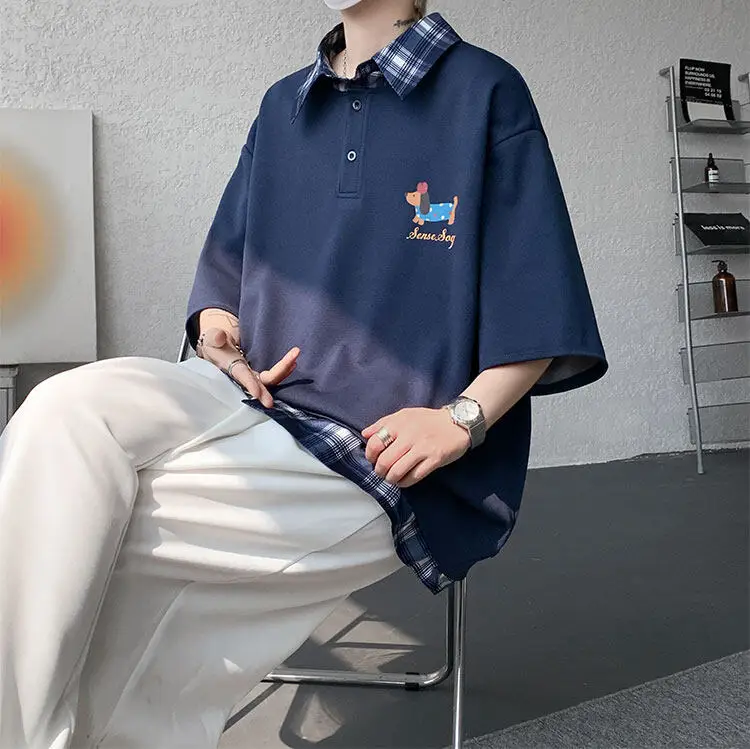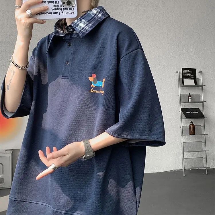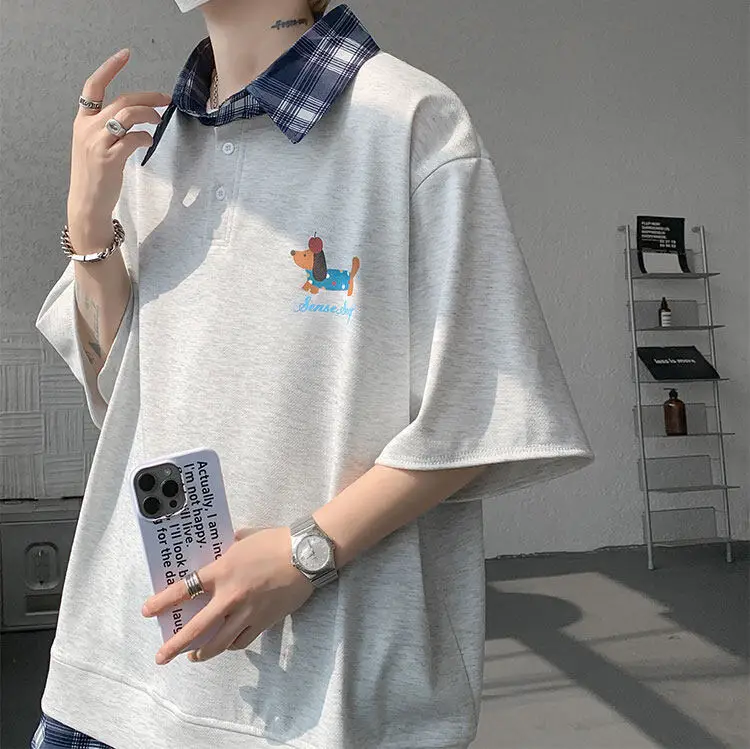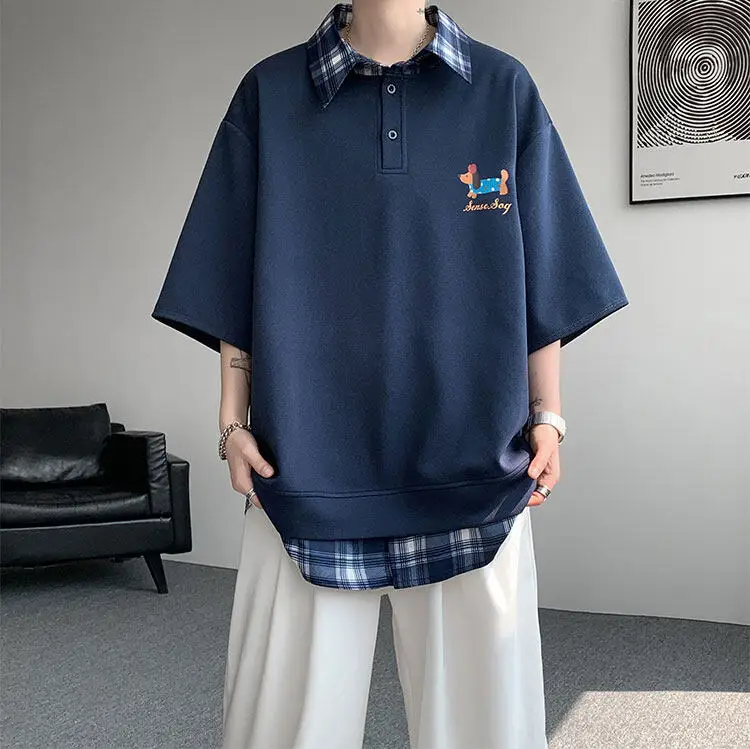 HEARUJOY - Dog Embroidery Plaid Polo Short Sleeve T-Shirt 2025 Summer Retro Couple T-shirts Splicing Fake Two Pieces Simple Tops