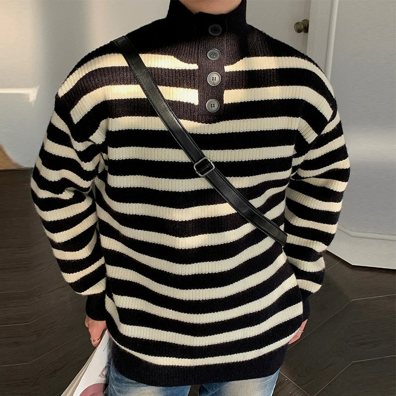 HEARUJOY - Fall Winter Daily Casual Men's Sweater Stylish Striped Crochet Knitted Pullover Men Fashion Turtleneck Buttoned Sweaters