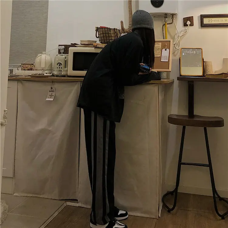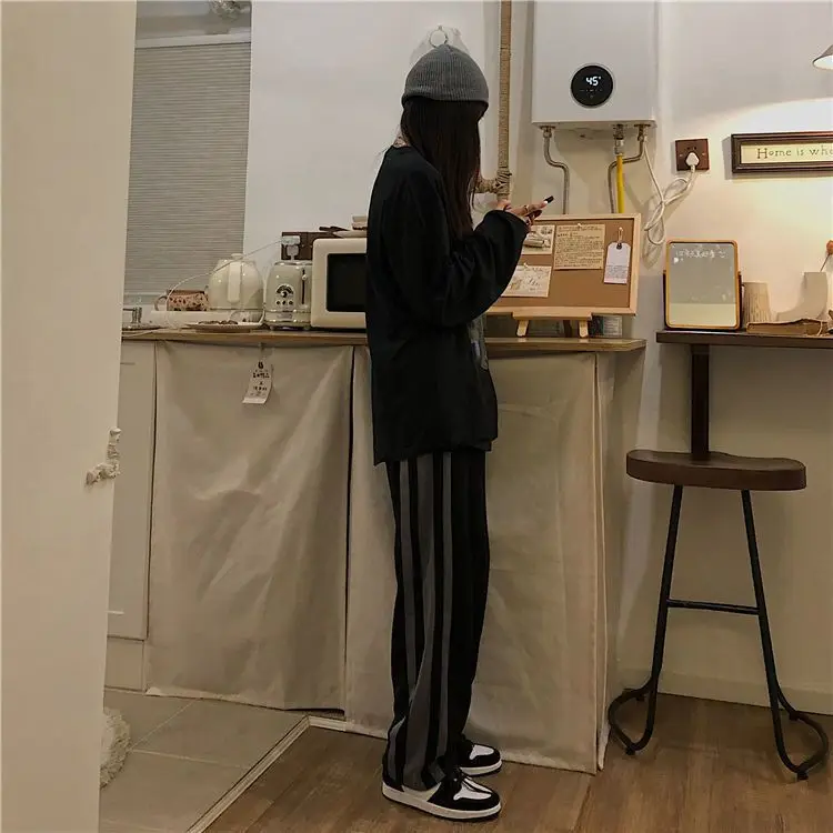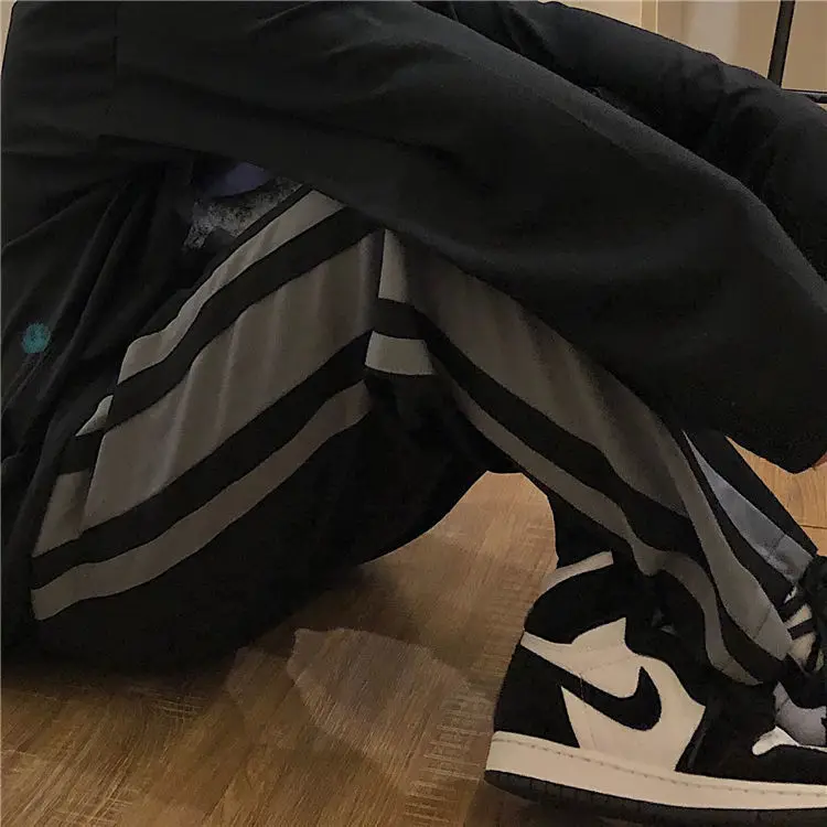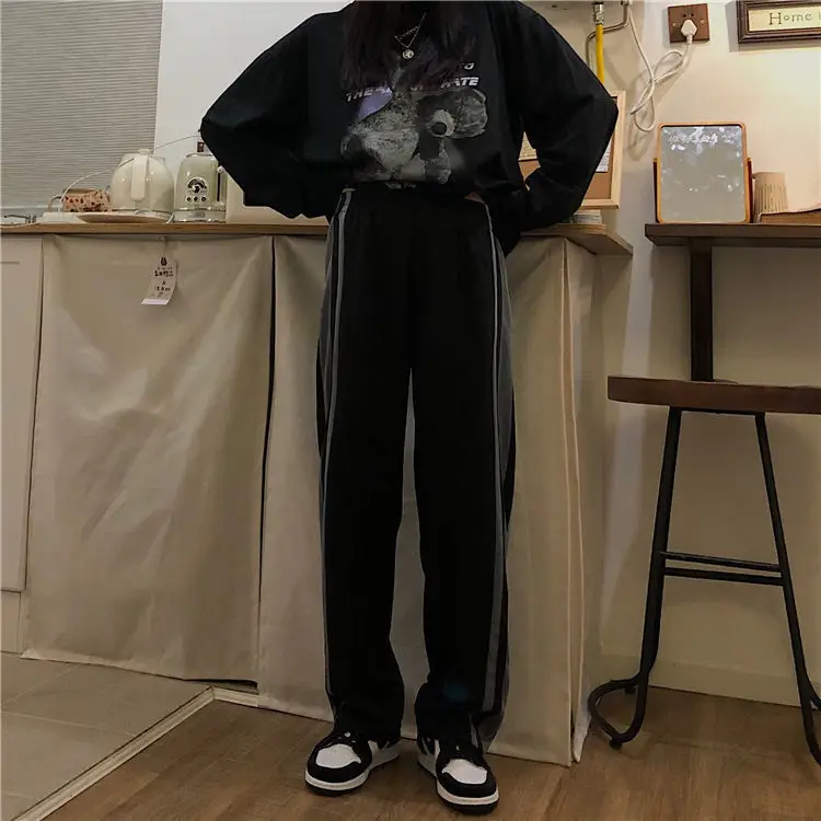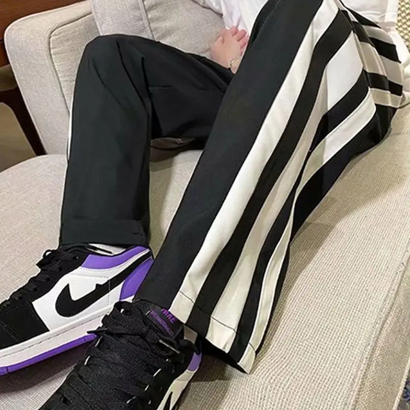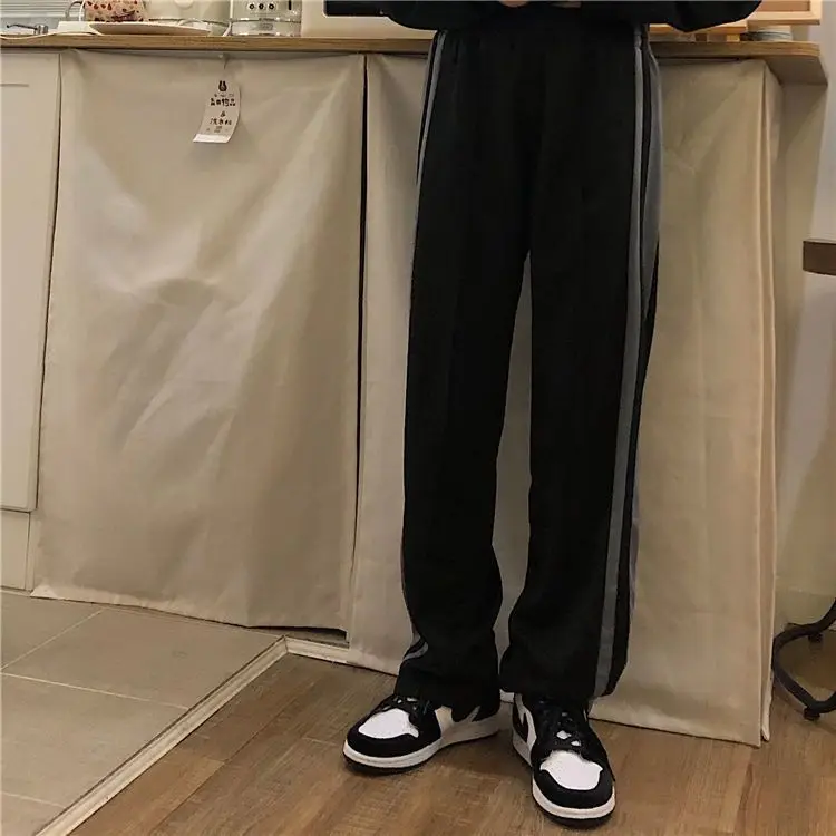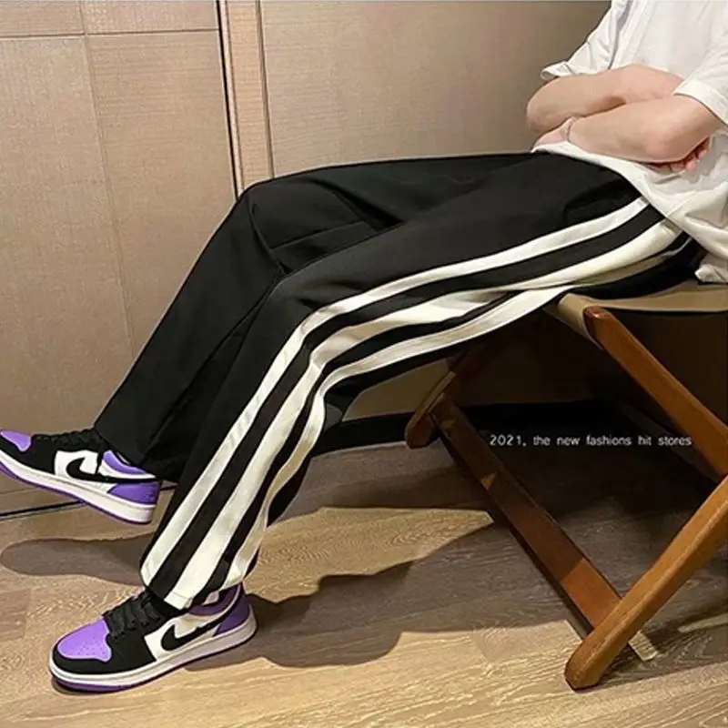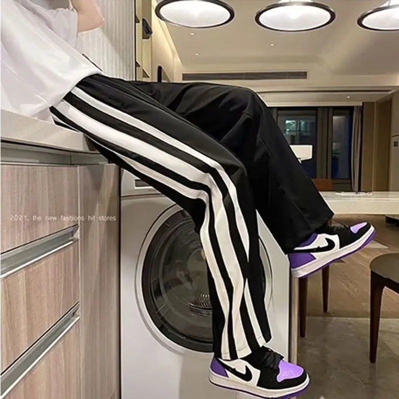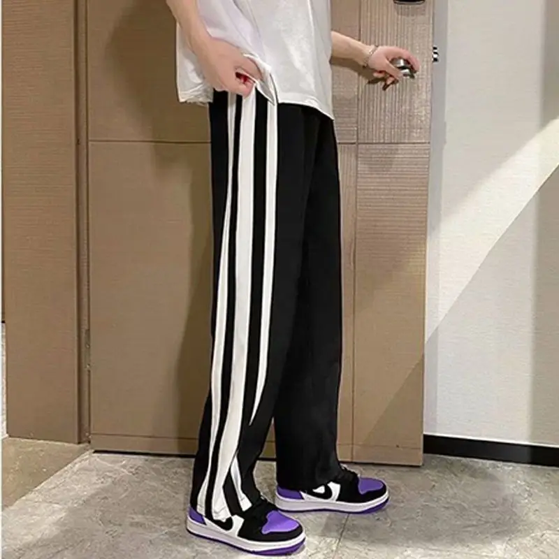 Hearujoy Fashion Preppy Style Loose Student Striped Sports Casual Straight Pants Men Elastic Waist Drawstring Pocket Wide Leg Trousers