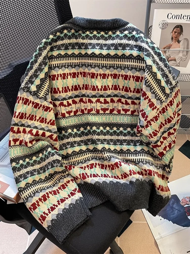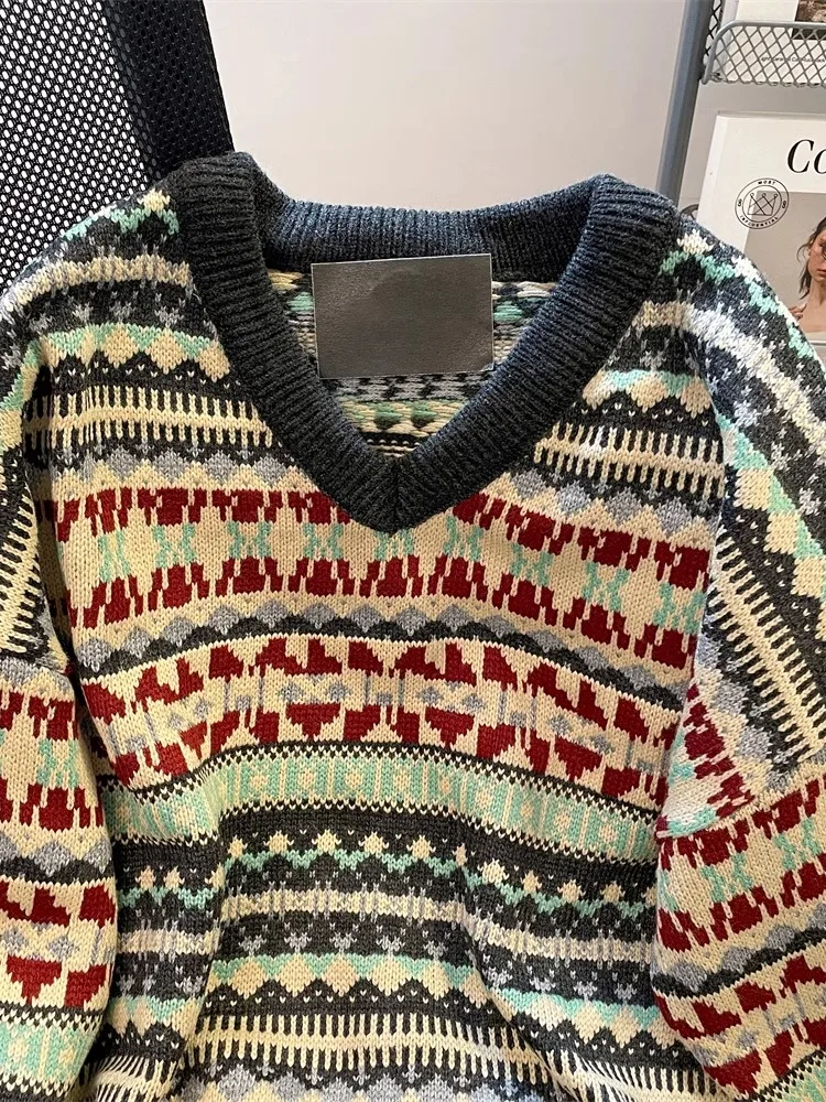 Hearujoy French Retro Jacquard Color Blocked V-neck Sweater Women Early Autumn Lazy Style Worn Outside Soft Sticky Knitted Sweater Top