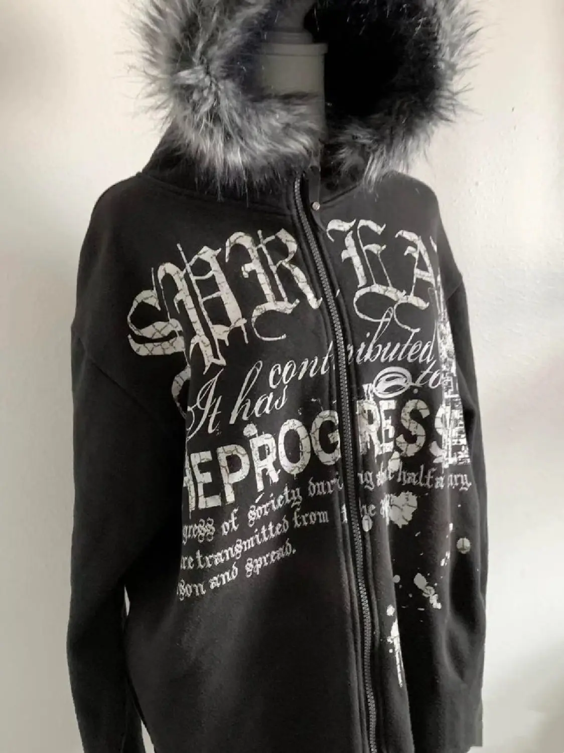 Hearujoy Gothic Retro Y2K Letter Pattern Black Plush Collar Zipper Hoodie Women's Autumn and Winter Warm 2000s Harajuku Cardigan Jacket