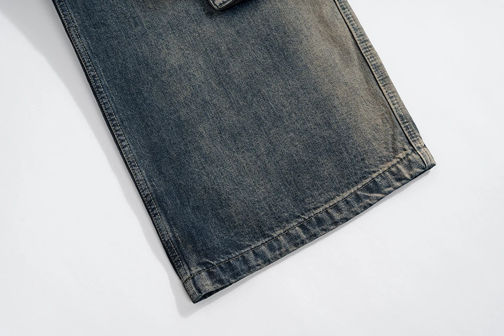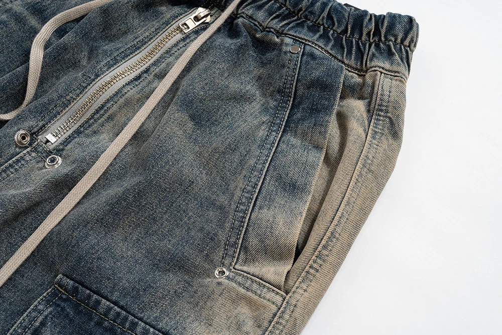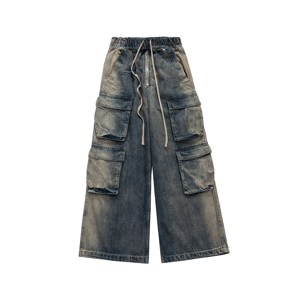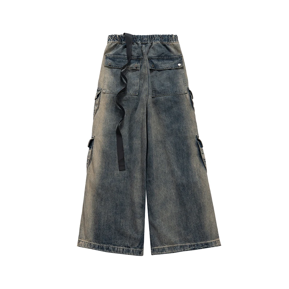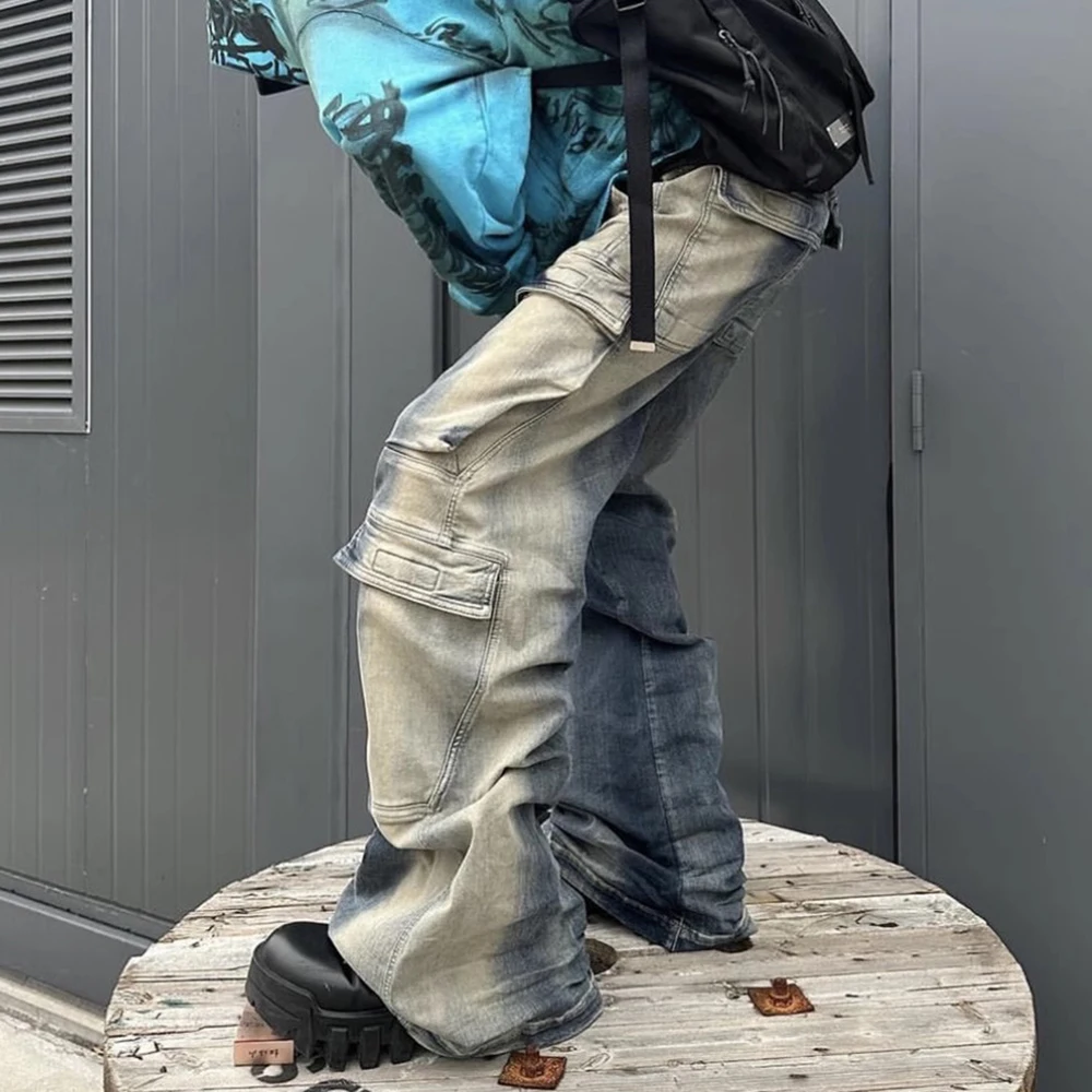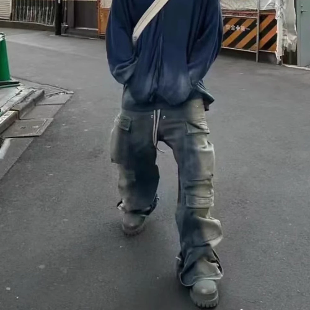 Hearujoy Gradient Ribbons Multi-pockets Drawstring Jeans for Men Harajuku Streetwear Baggy Y2K Denim Trousers Oversized Cargos