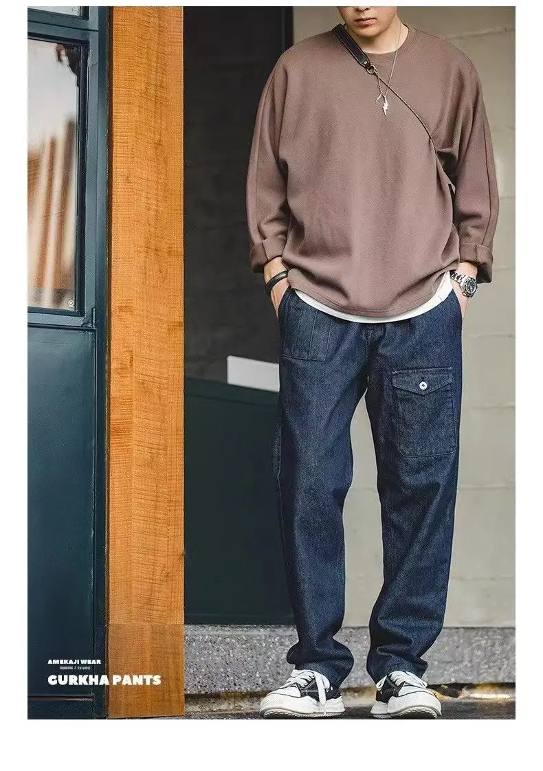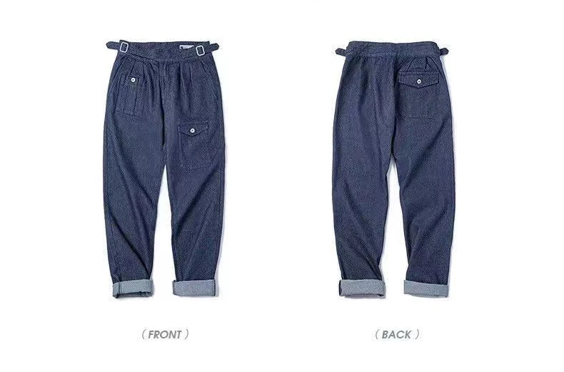 HEARUJOY - High Street Men Gurkha Jeans Cargo Pants Adjustable Waist Buckle Naples Trousers American Vintage Casual Loose Denim Pants