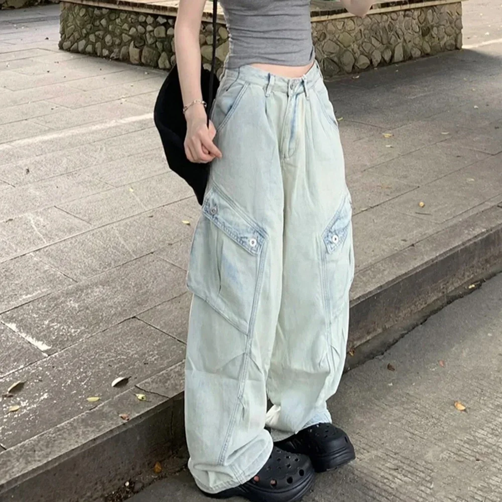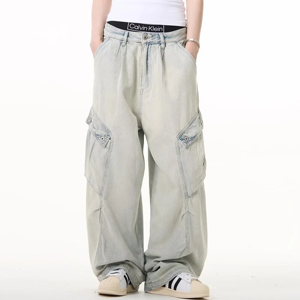 Hearujoy High Street Side Big Pockets Washed Baggy Mens and Womens Blue Jeans Pants Straight Ropa Hombre Loose Denim Trousers Oversized
