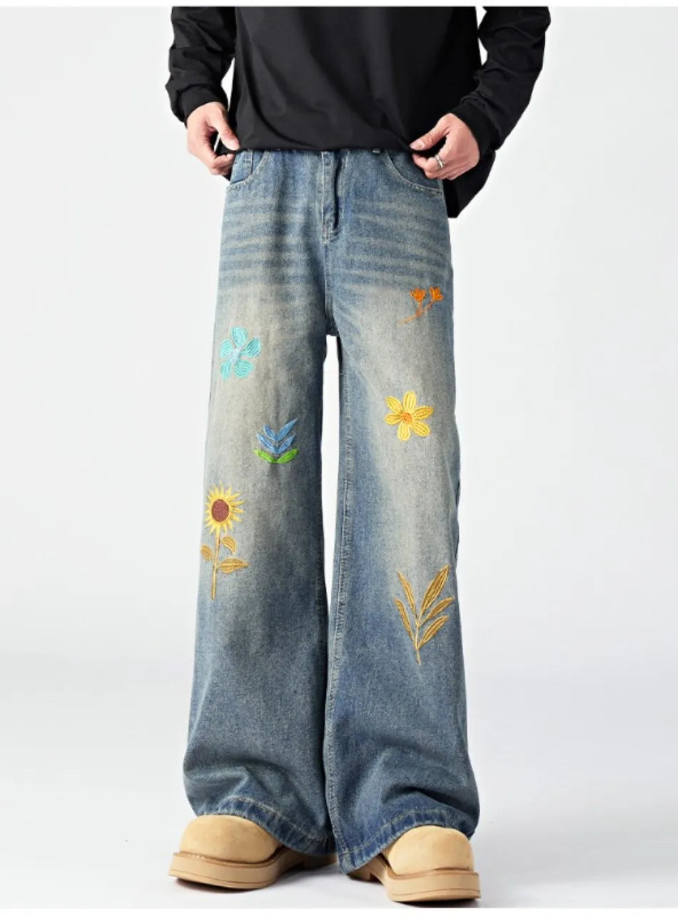 HEARUJOY - Hip Hop Trendy Jeans Mens Flower Embroidery Loose Straight Tube Cowboy Pants Size M-3XL Multiple Pockets Denim Trousers Male