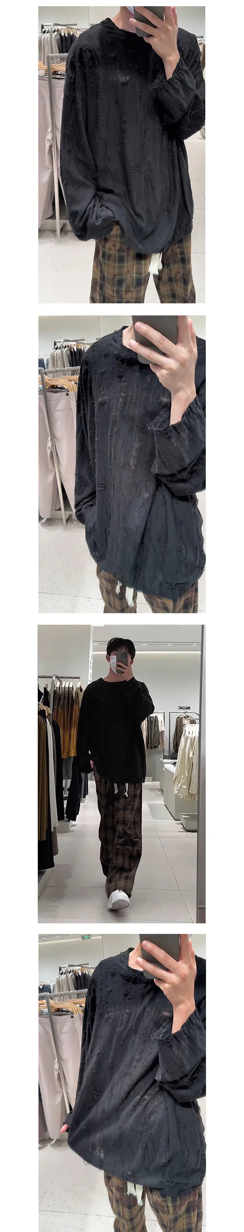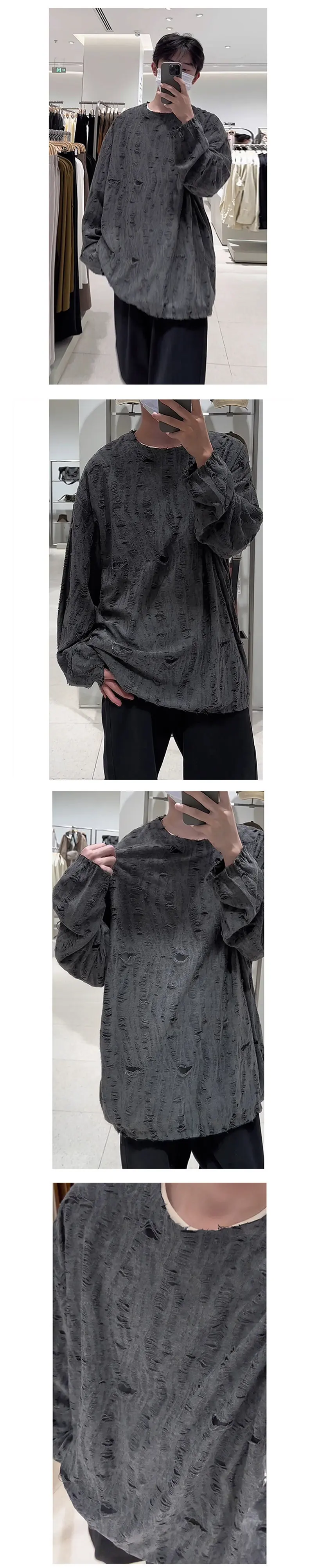 Hearujoy Hole Long Sleeved T-shirt Men Fashion Retro Round Neck T Shirt Men Japanese Streetwear Hip-hop Loose Ripped T Shirt Mens Top