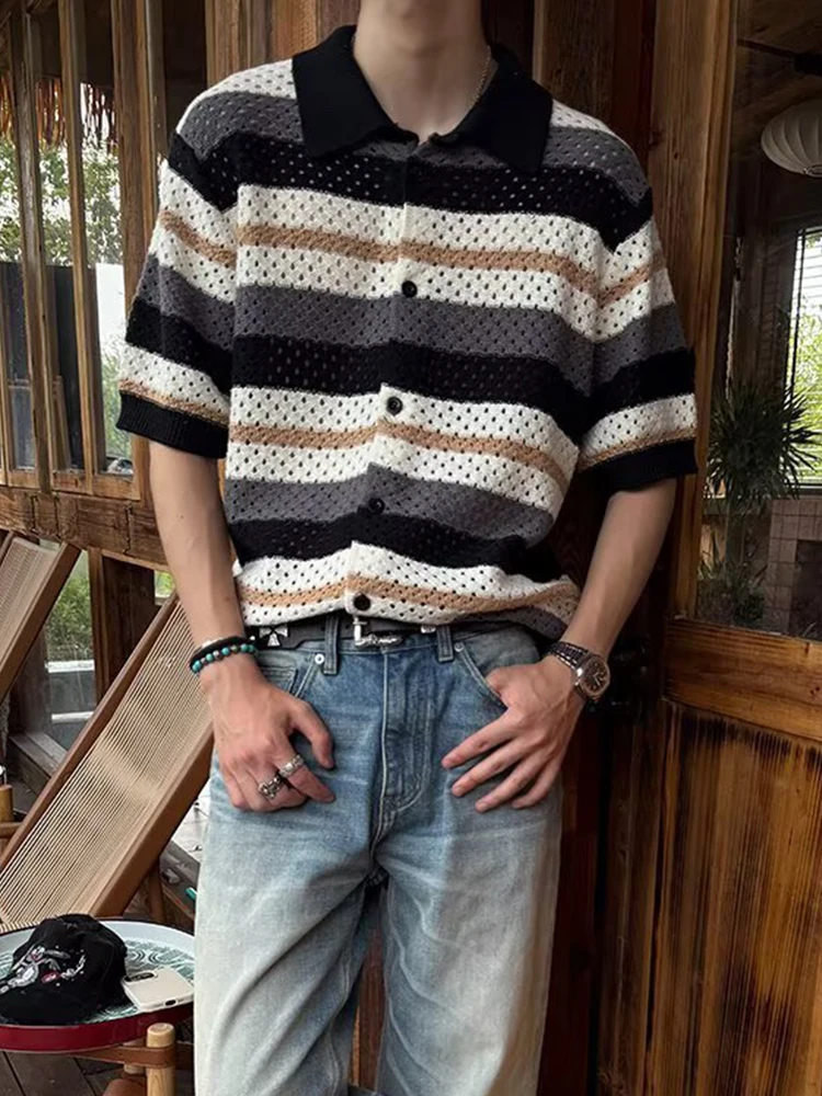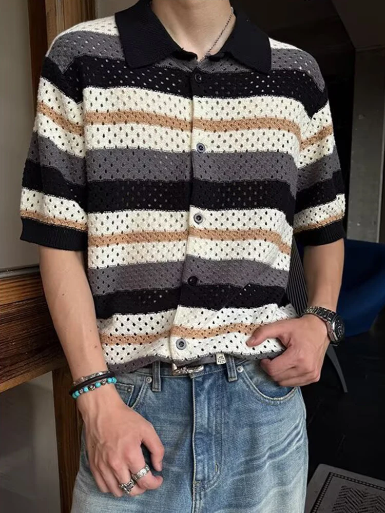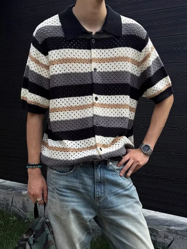 HEARUJOY - Ice Silk Knitting Shirts Mens 2025 Summer New Casual Striped Knit Cardigan Tops Men Clothing Vintage Buttoned Short Sleeve Shirt