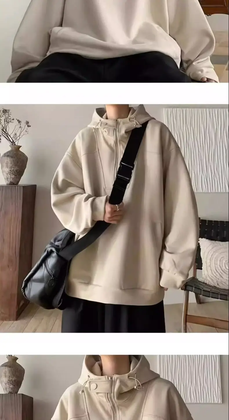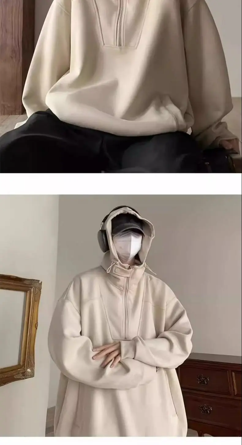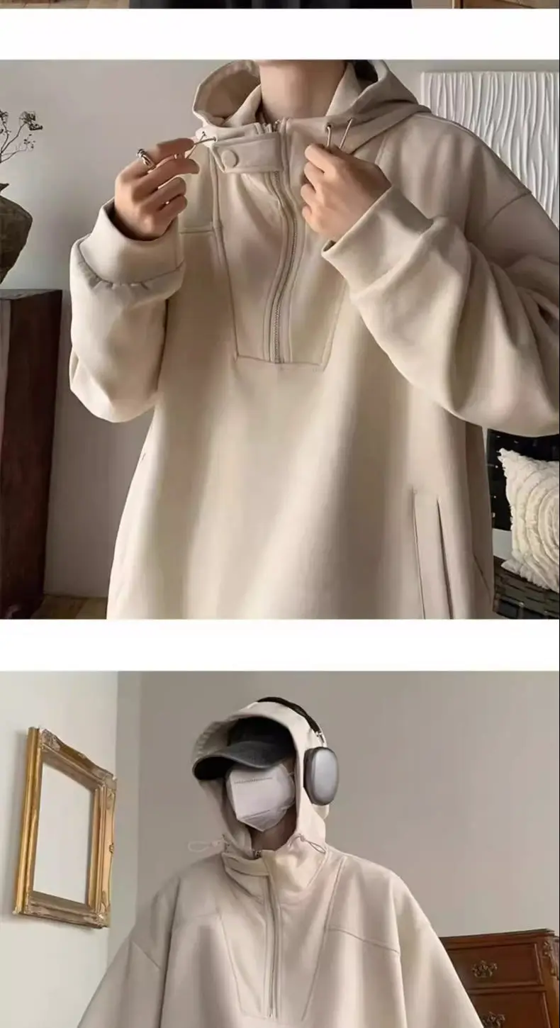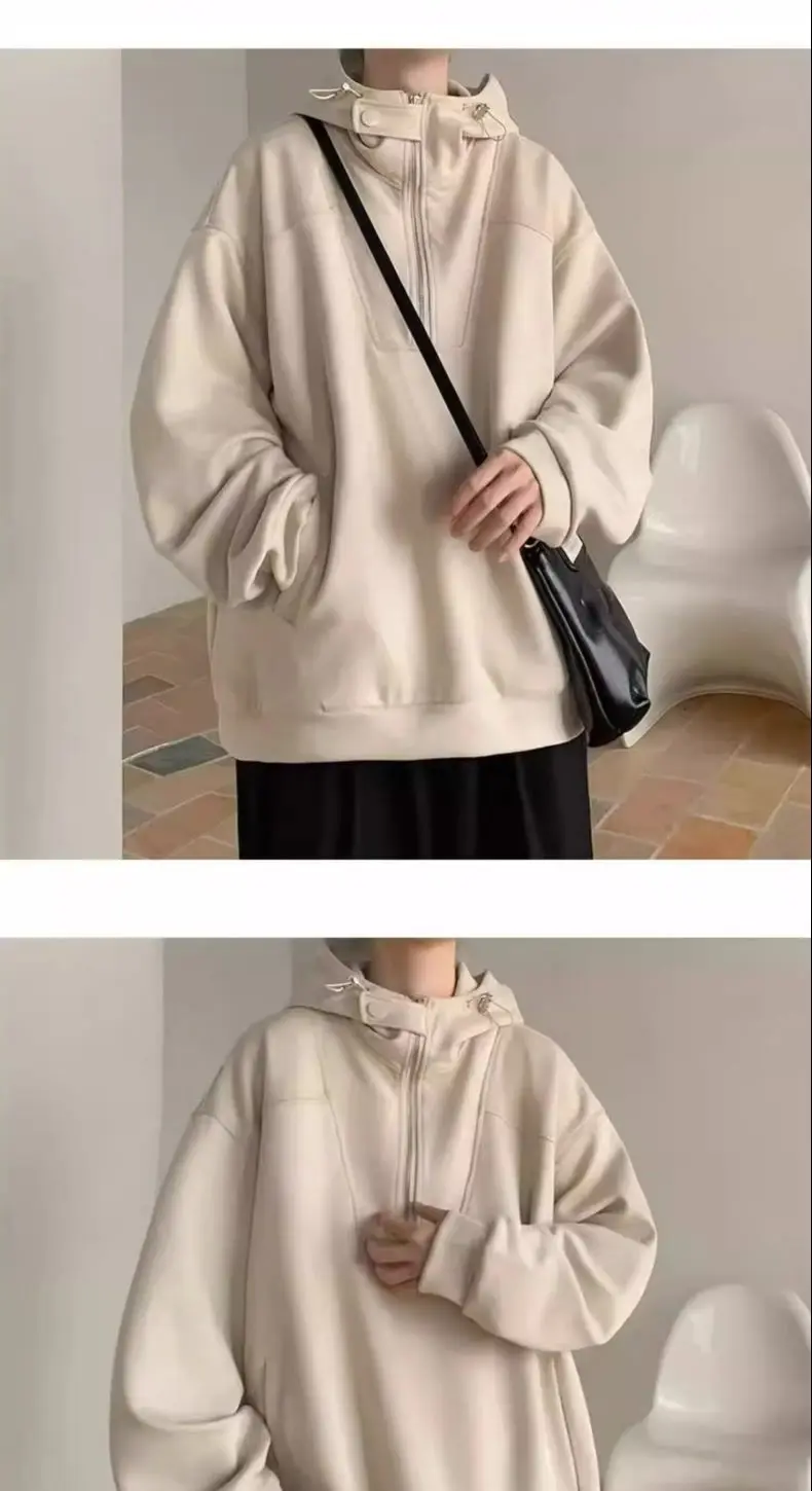 HEARUJOY - Japanese Retro Semi-zipper Solid Color Hooded Sweatshirt Men Women Autumn Winter Trendy Brand Loose Couple Casual Jacket