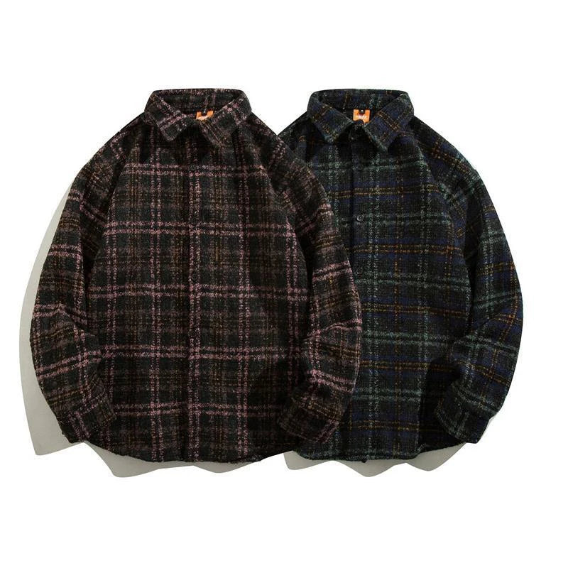 HEARUJOY - Japanese Retro Woolen Plaid Shirt For Men Autumn Winter Long Sleeved Top Fashion Vintage Shirts Coat Trendy Clothing Streetwear