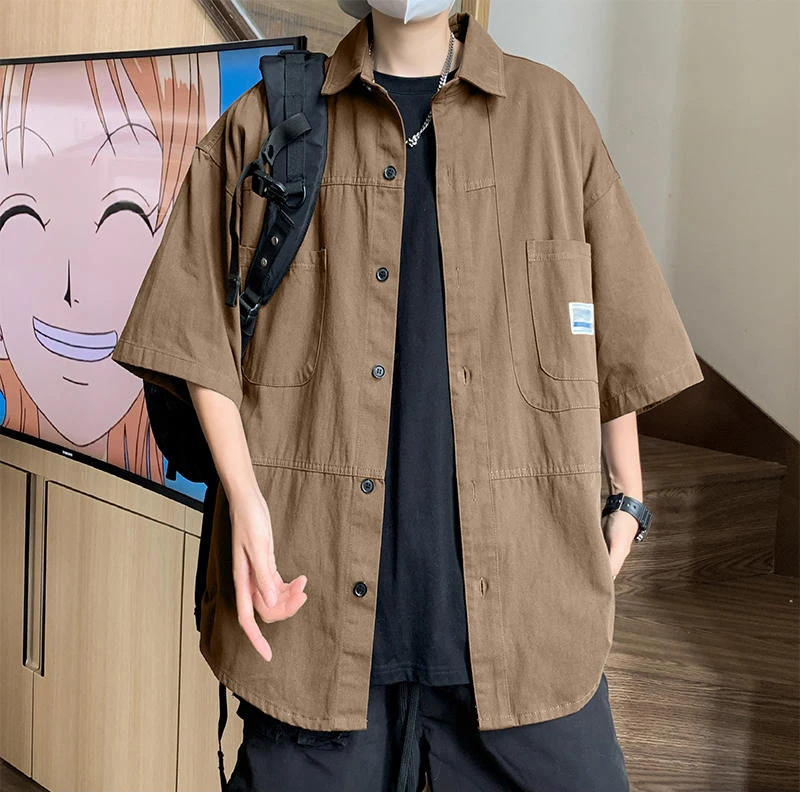 Hearujoy Japanese Retro Workwear Short-sleeved Shirt Men's Summer Trendy Casual Loose Cotton Shirt Three-quarter Sleeve Jacket Top Urban
