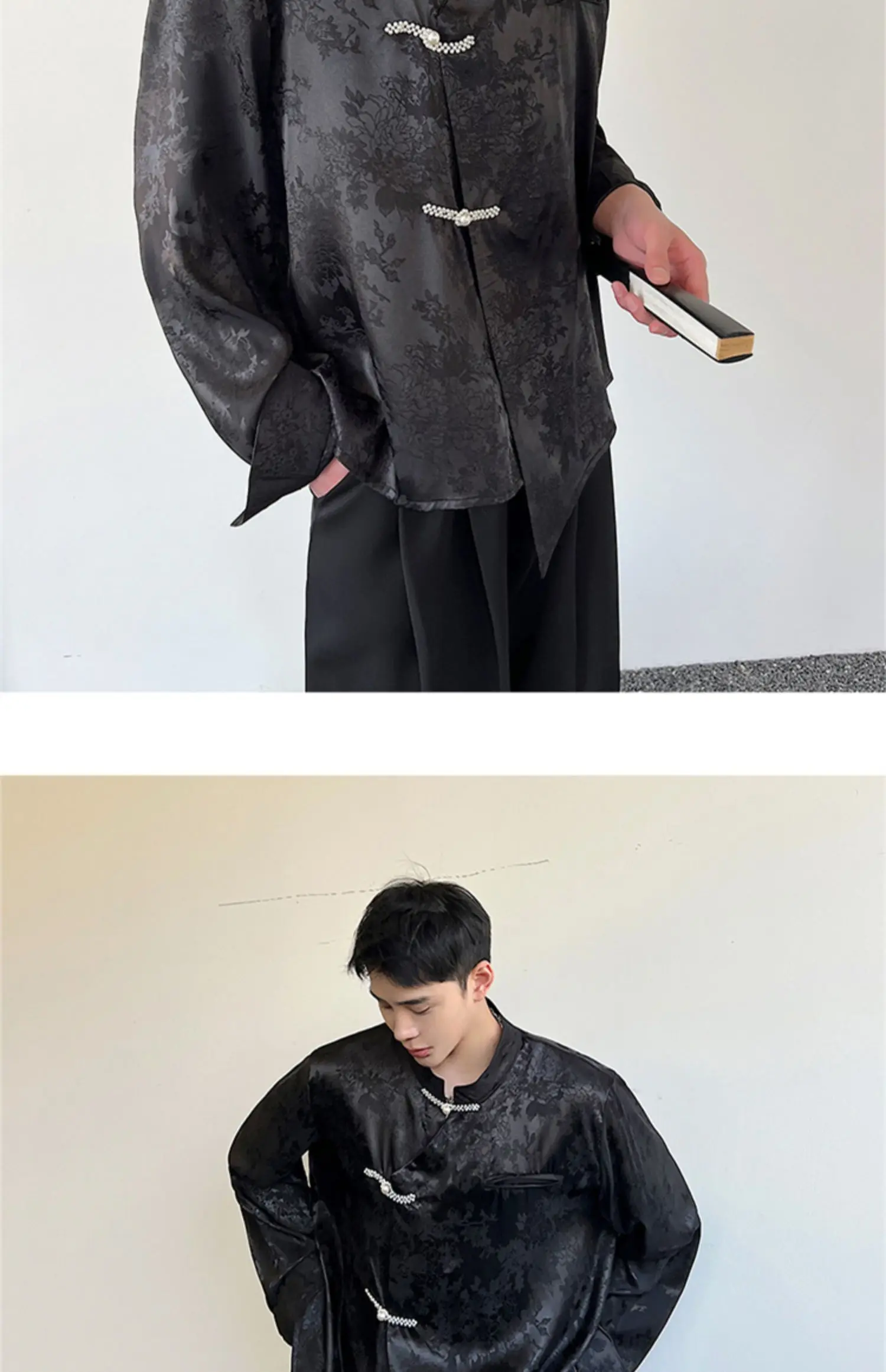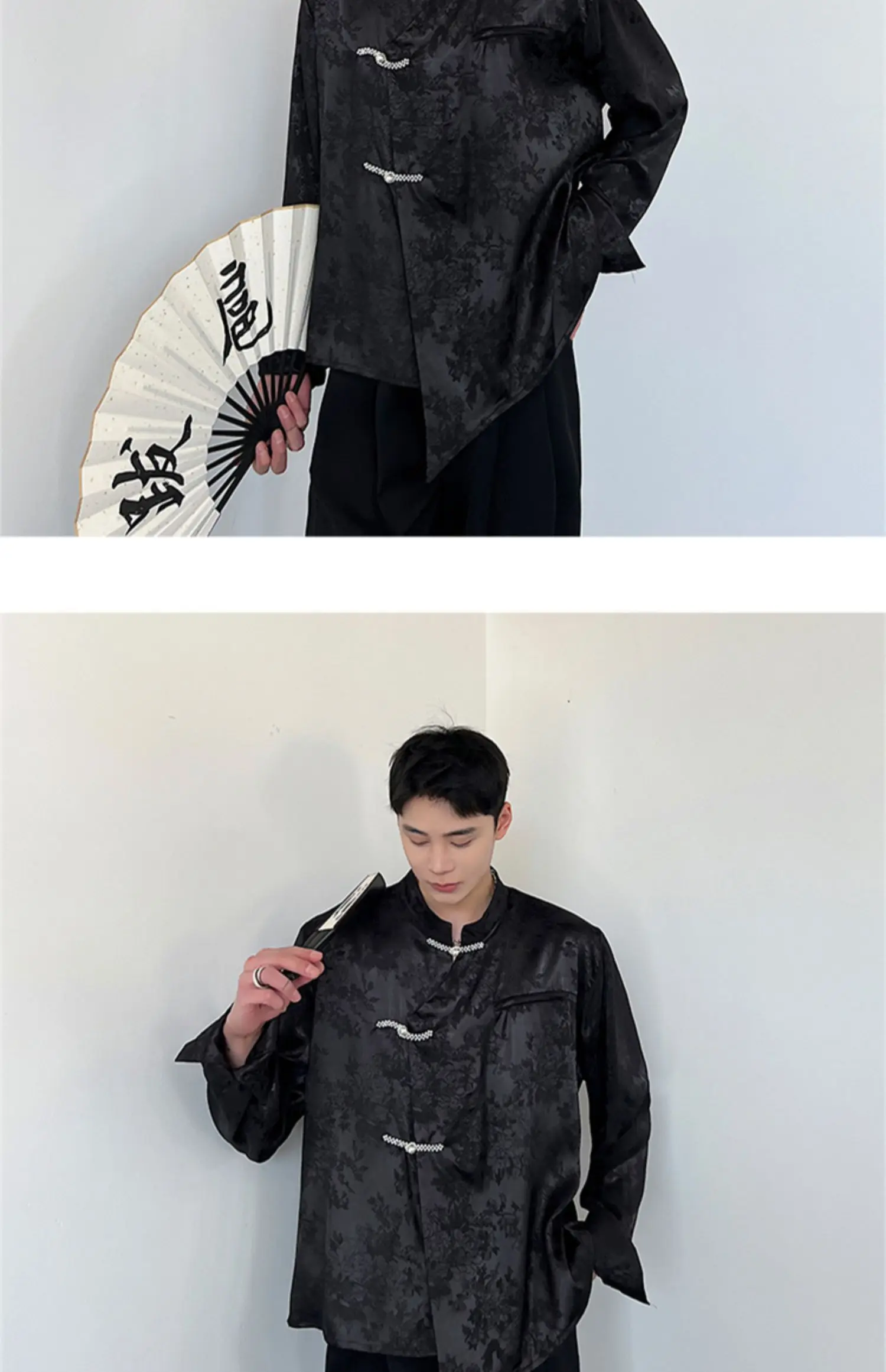 Hearujoy Korea Fashion Vintage Spring Men's Print Chinese Style Long Sleeve Shirts Male Cardigan Stand Collar Dress Shirts