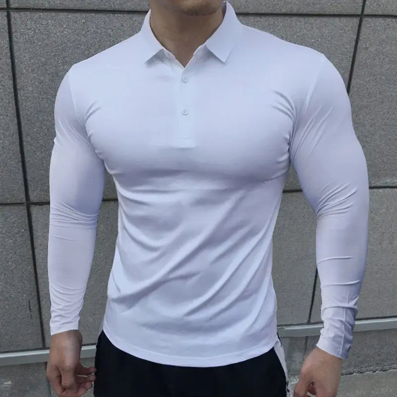HEARUJOY - Korean Autumn Casual Fitness Polo Shirt Men Solid Button Slim Elastic Versatile Sports Breathable Quick Drying Long Sleeved Tops