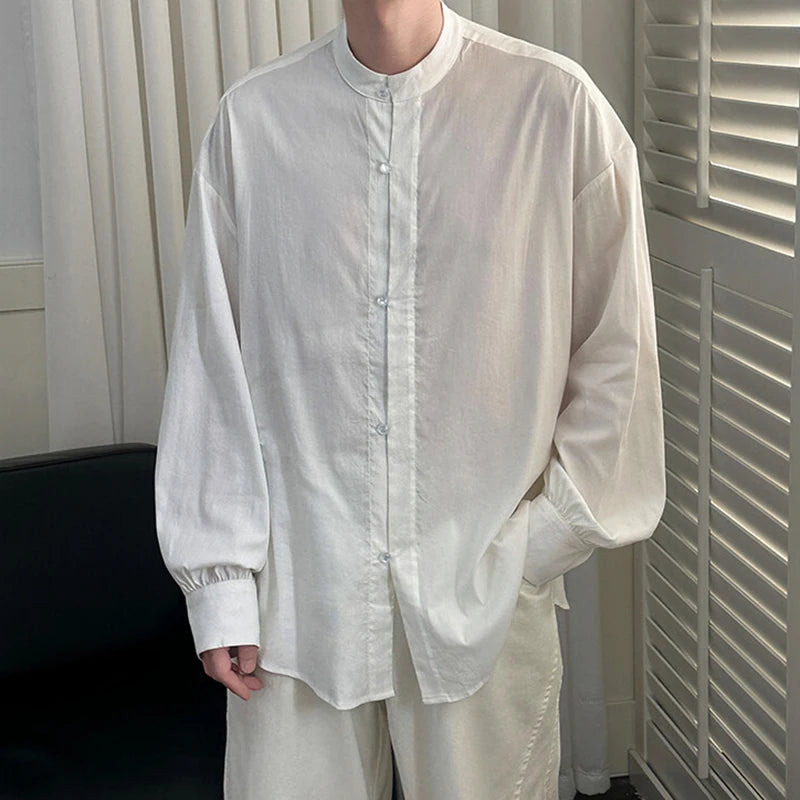 HEARUJOY - Korean Style Men's Casual Shirts Stand Collar Solid Color Single Breasted Loose Long Sleeved Male Tops New Summer