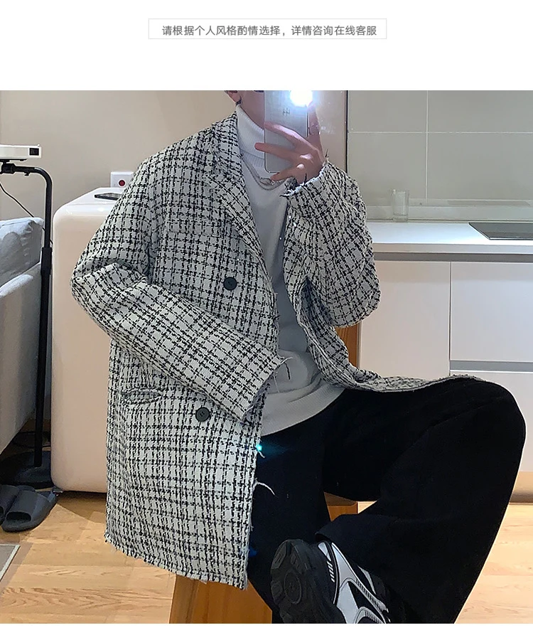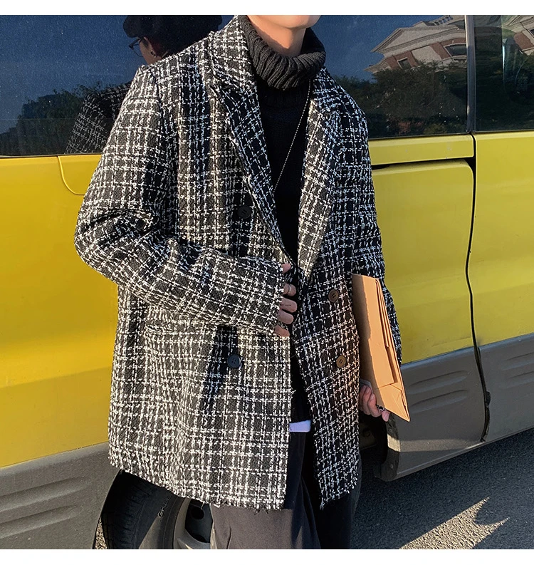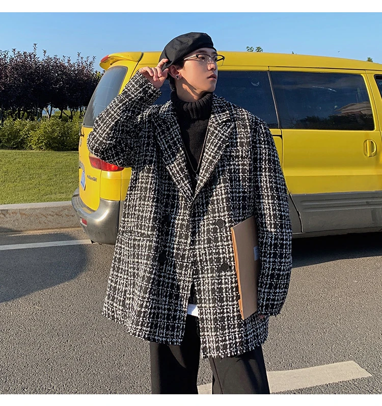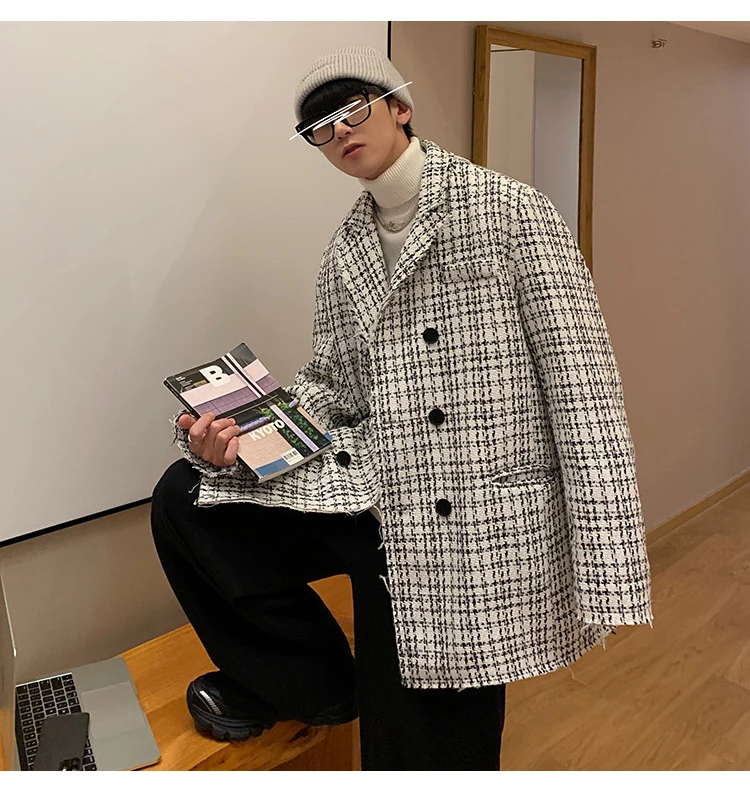 Hearujoy Korean-style Trend Plaid Blazers Men Leisure Loose Suit Jackets Male Couple Streetwear Autumn All-match Suit-tops Black/White