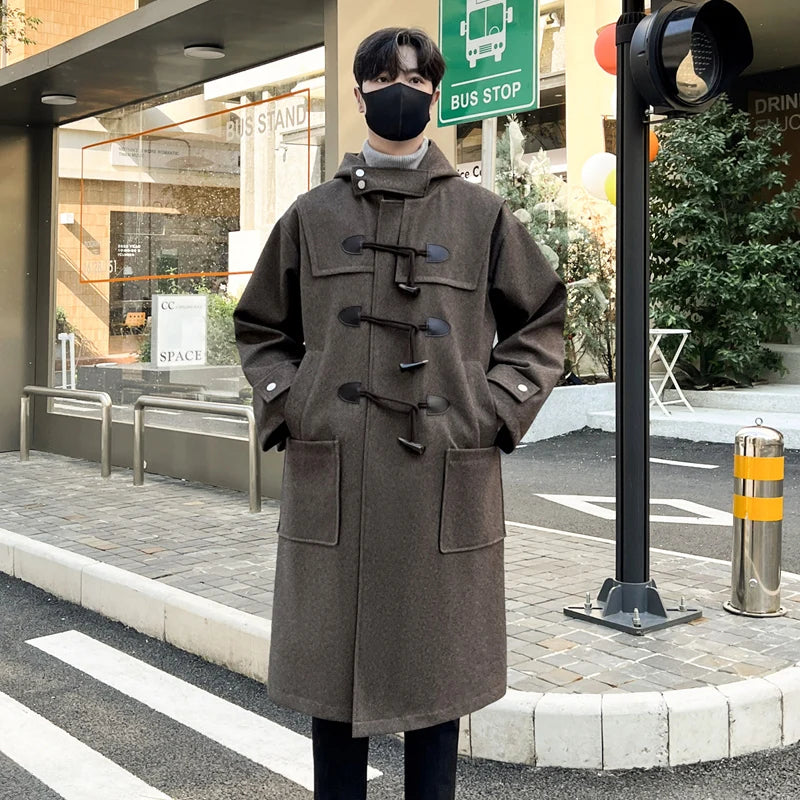 Hearujoy Korean-style Woolen Trench Men Horn Button Casual Long Windbreaker Winter Hooded Jacket Coats Fashion Trenchcoat