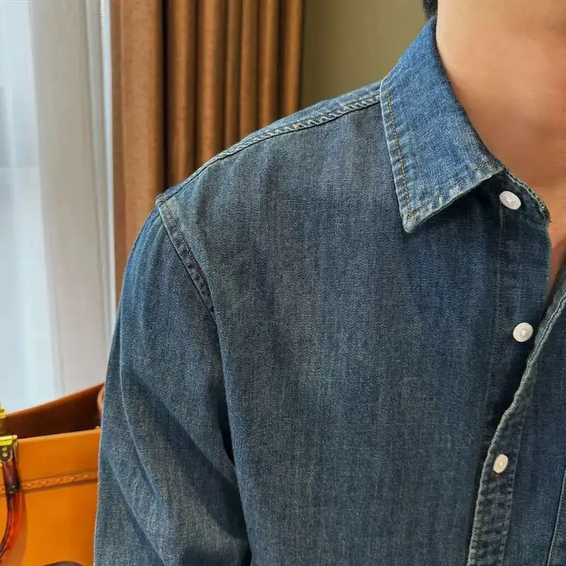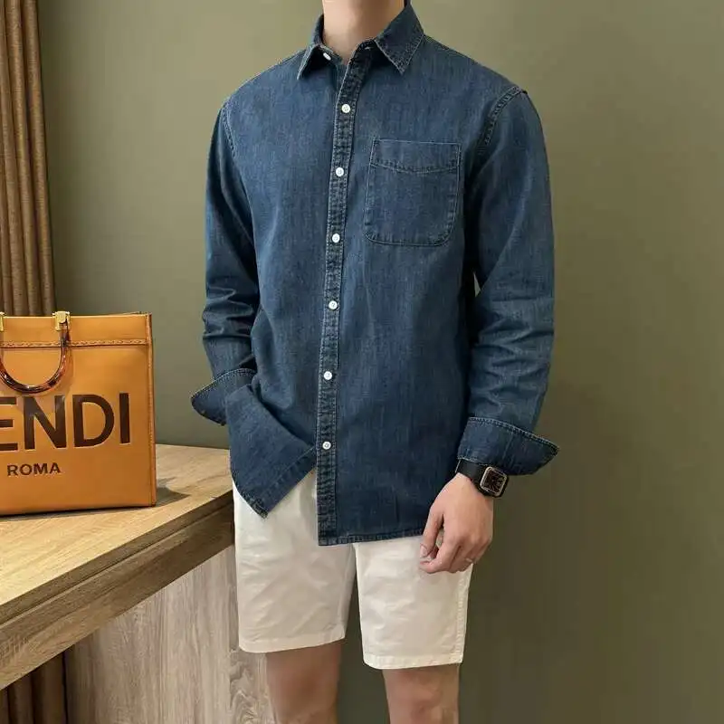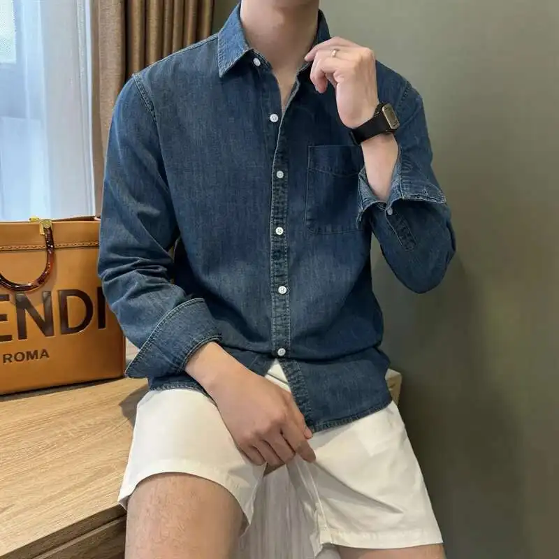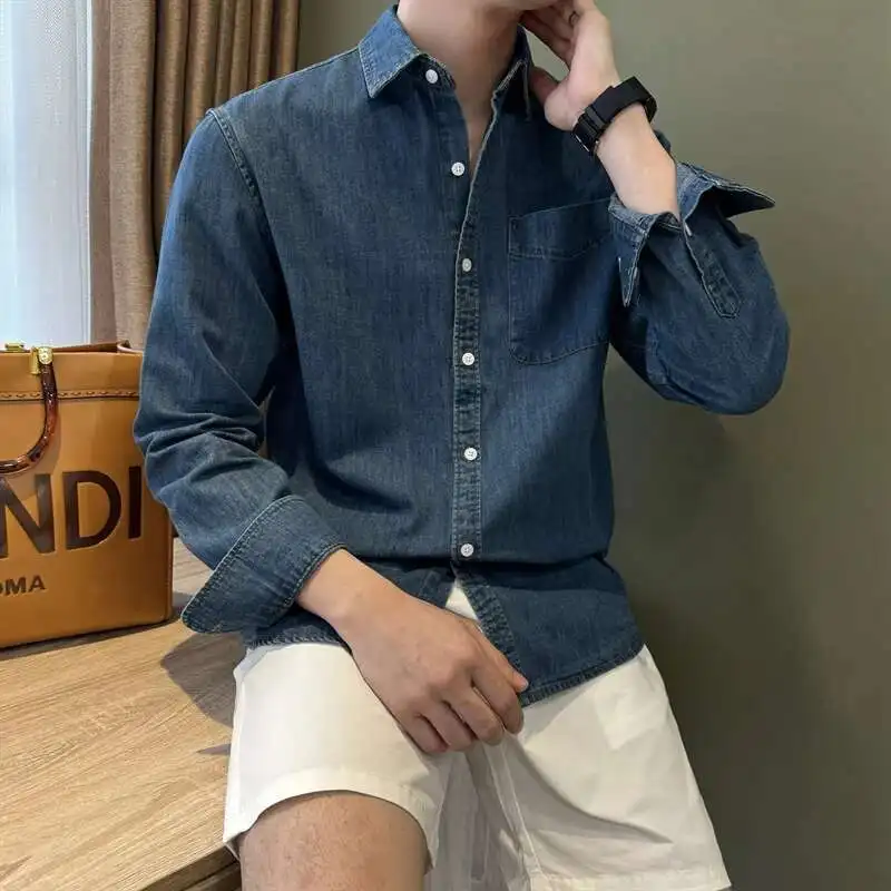 HEARUJOY - Lapel Collar Cotton Blend Denim Shirt Long Sleeve Shirt Retro Shirt British Versatile Casual Shirt Man Camisa Social Masculina