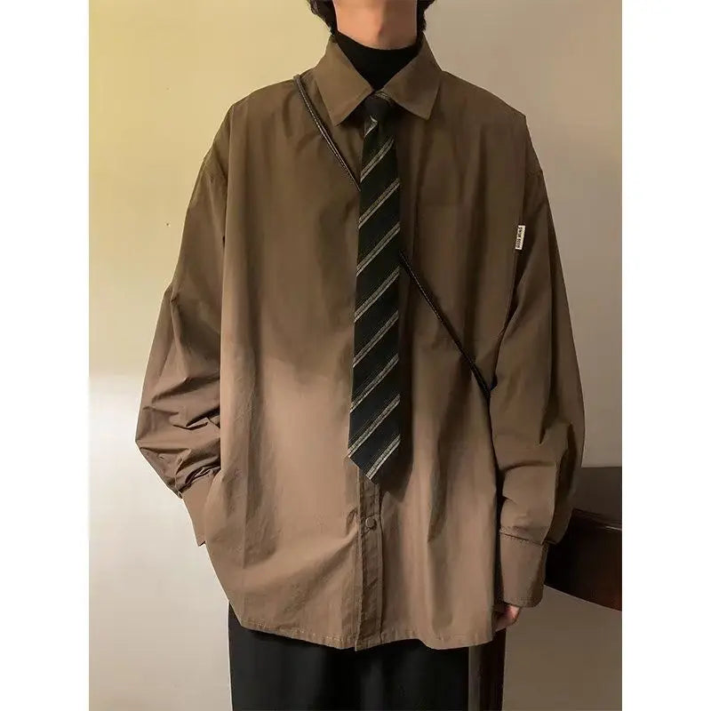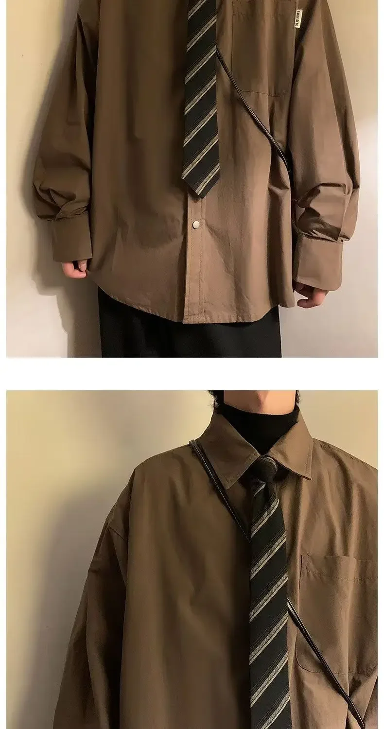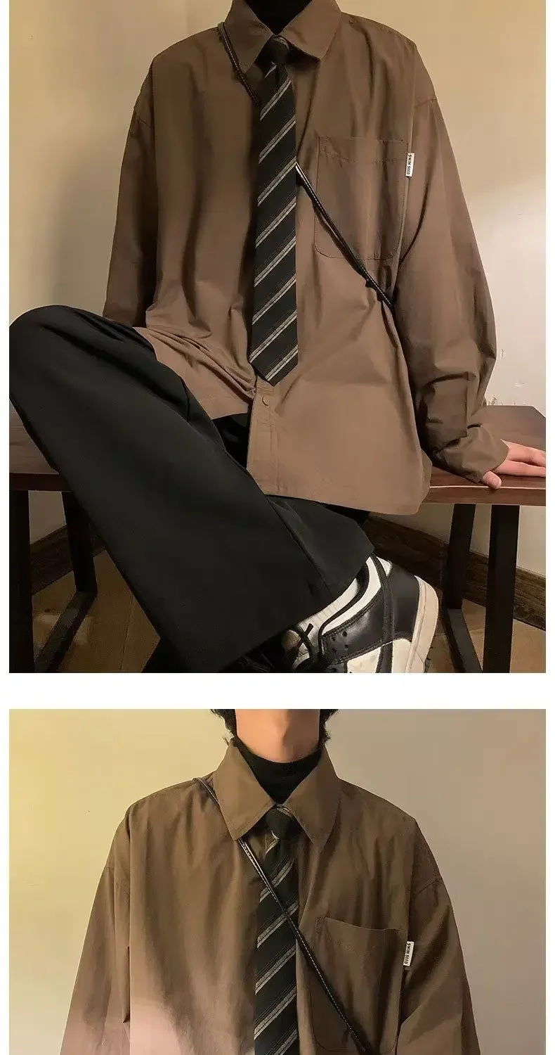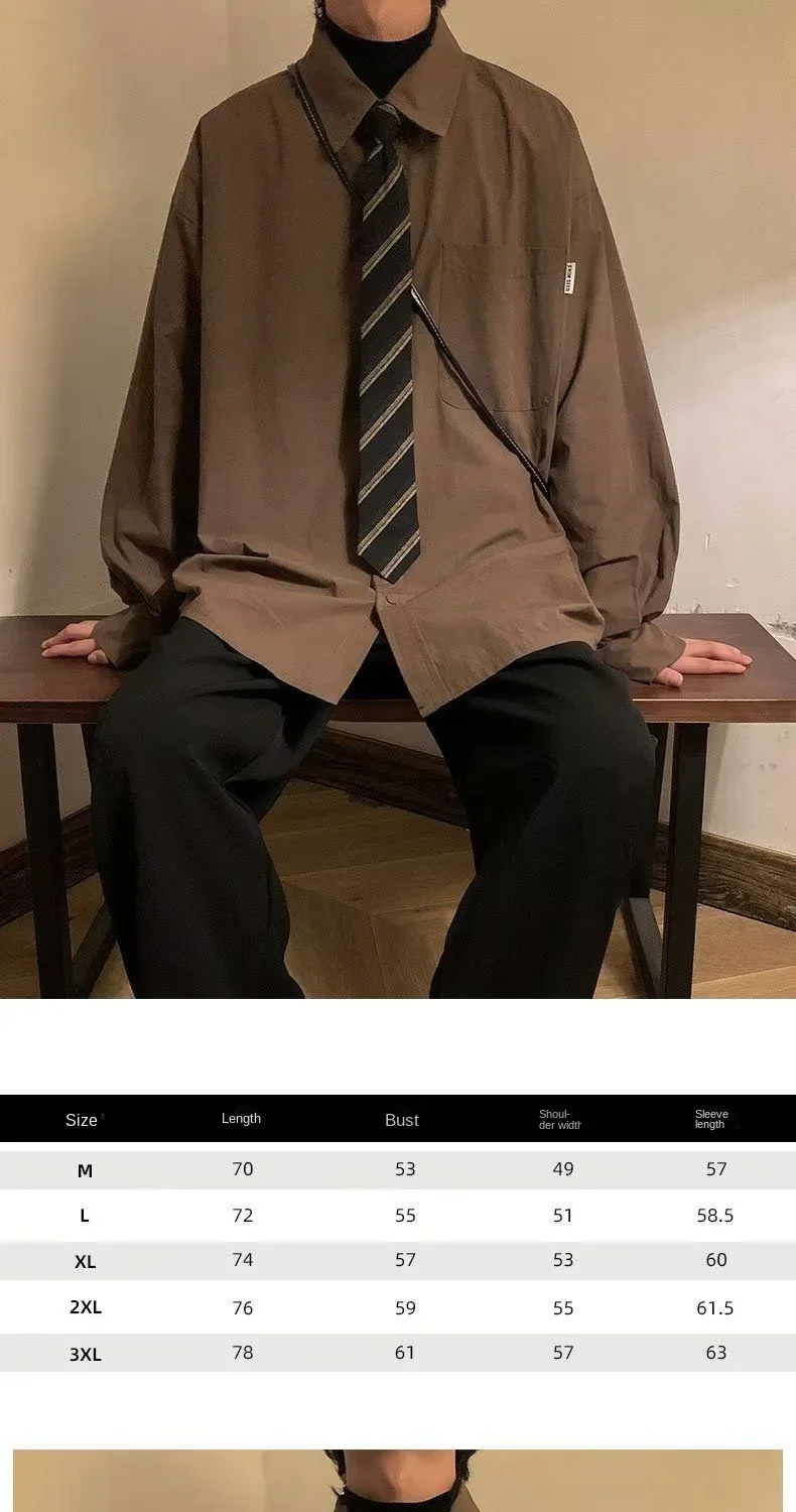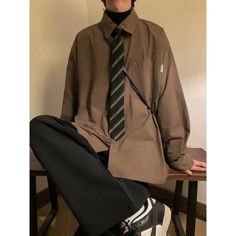 HEARUJOY - Long-sleeved Shirt Men Solid Color Japanese Retro Spring Loose Brown Trendy Versatile Cardigan